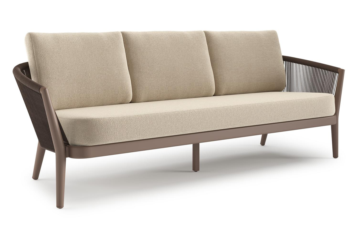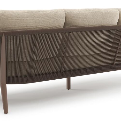 Canapé de jardin Orso en aluminium taupe en corde ronde tissée verticalement noir et coussins en all weather cosytica Althea Chalk | Exterioo