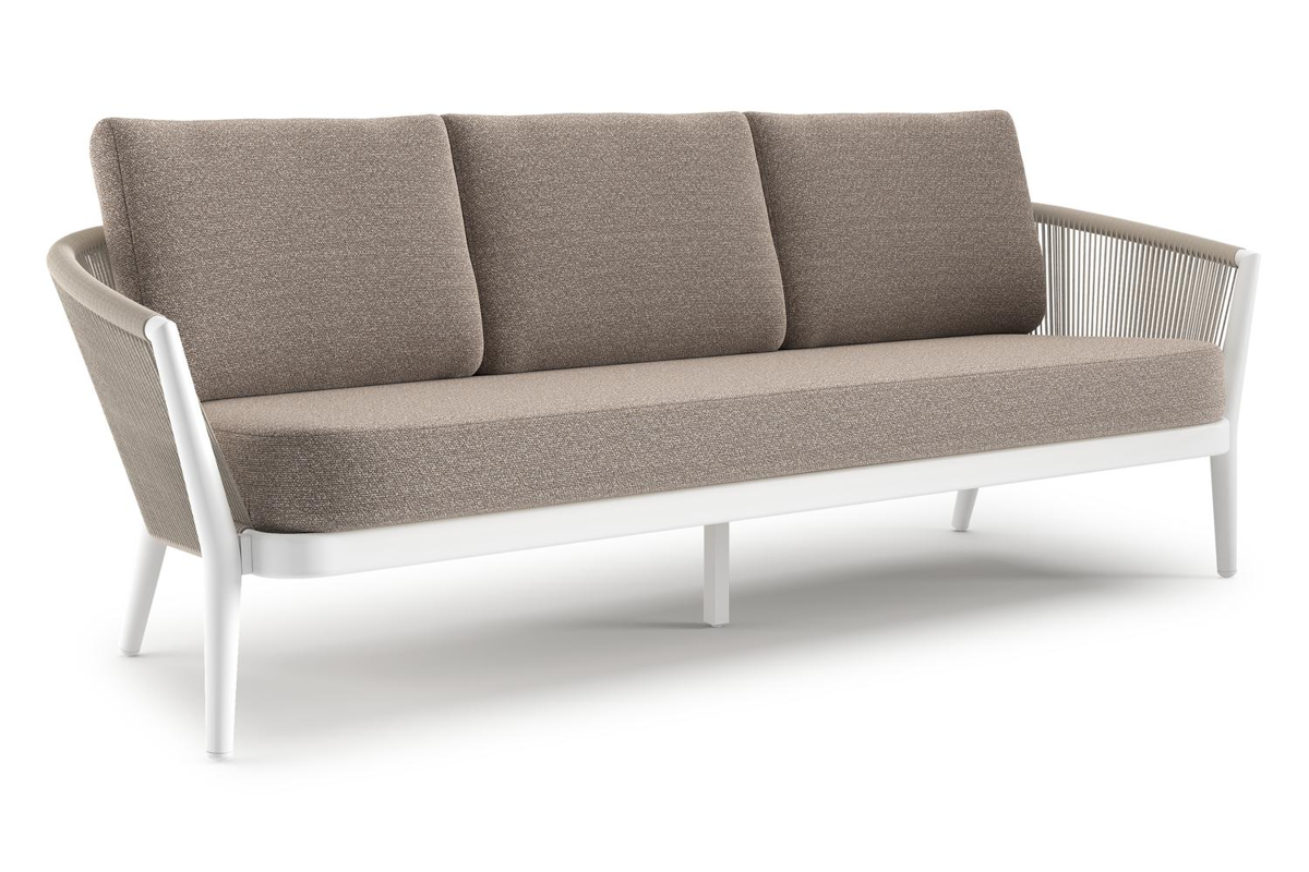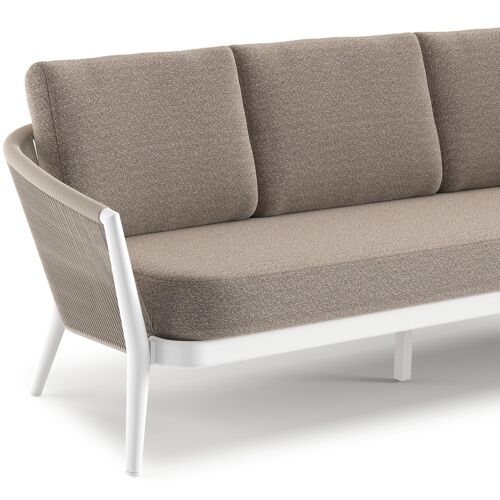 Canapé de jardin Orso en aluminium blanc en corde ronde tissée verticalement beige et coussins en all weather sunbrella® luxe Wander Manioc | Exterioo