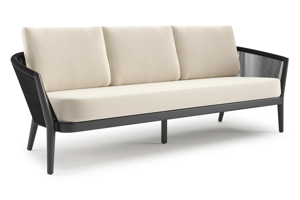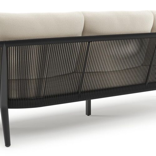 Canapé de jardin Orso en aluminium noir en corde ronde tissée verticalement noir et coussins en all weather cosytica Althea Off White | Exterioo
