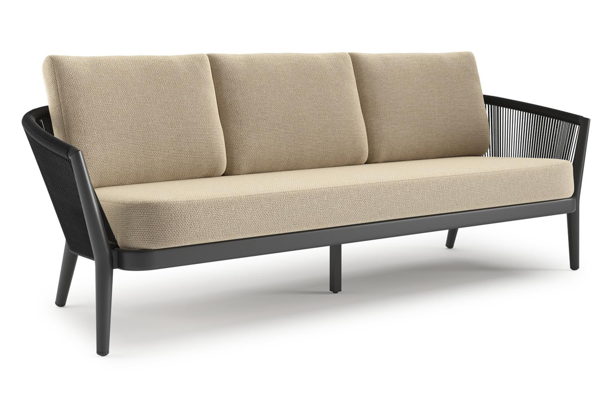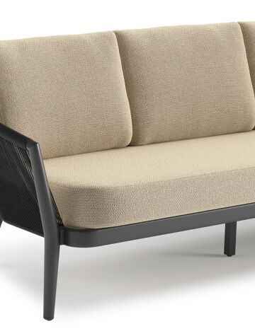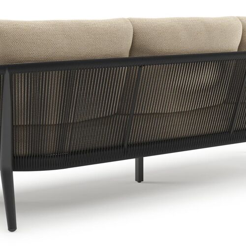 Canapé de jardin Orso en aluminium noir en corde ronde tissée verticalement noir et coussins en all weather cosytica Althea Camel | Exterioo