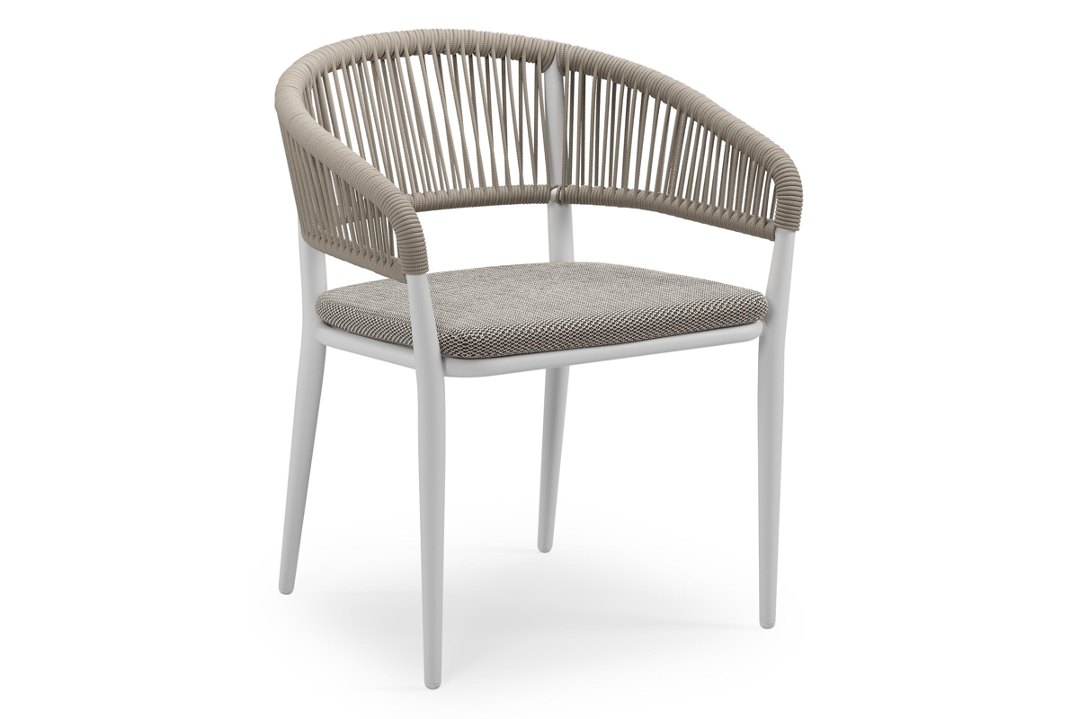 Chaise de jardin empilable Tolfa en aluminium blanc et corde ronde tissée verticalement beige avec coussin en All Weather Sunbrella® Luxe Lopi Pepper | Exterioo