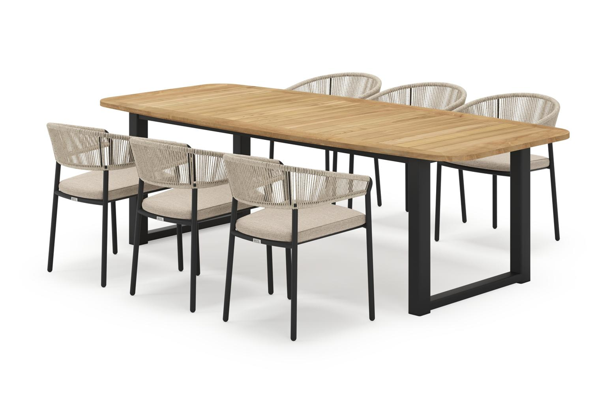 Livo ensemble de jardin forme de bateau en aluminium noir en teck natural finish avec 6 chaises de jardin Zamora | Exterioo