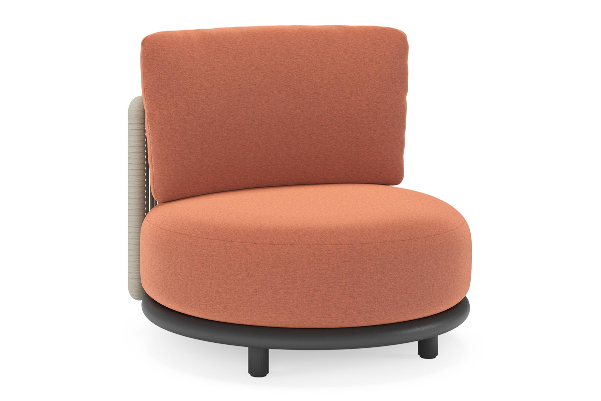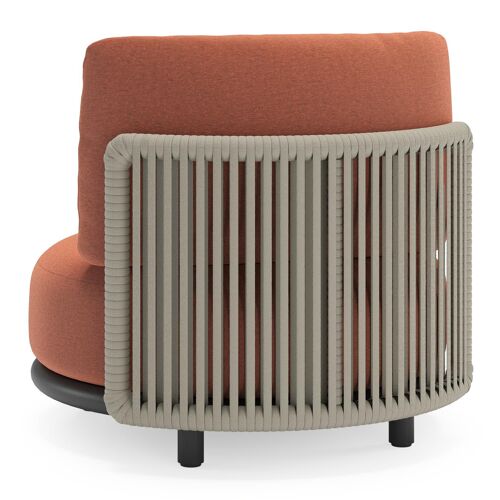 Fauteuil de jardin Lomano en aluminium noir et corde luxe plate tissée verticalement beige et coussins en all weather sunbrella® luxe Heritage Rust | Exterioo