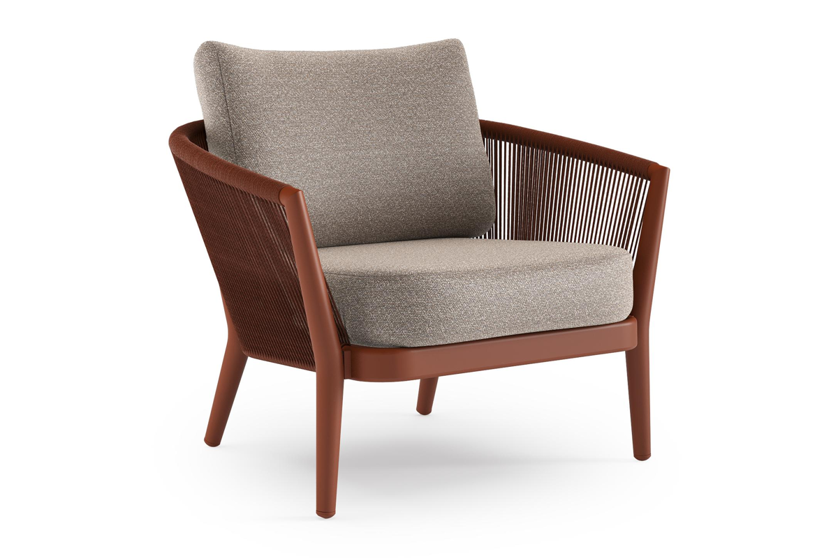 Fauteuil de jardin Orso en aluminium brun rouille en corde ronde tissée verticalement brun rouille et coussins en all weather sunbrella® luxe Wander Manioc | Exterioo