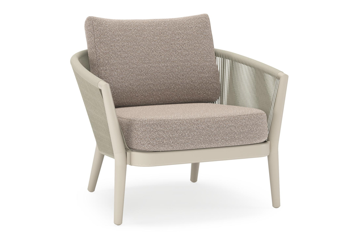 Fauteuil de jardin Orso en aluminium beige en corde ronde tissée verticalement beige et coussins en all weather sunbrella® luxe Wander Manioc | Exterioo