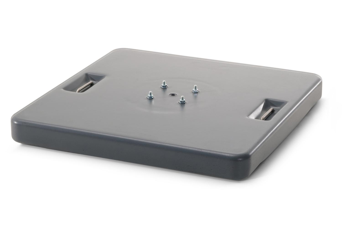 Le Pied de parasol Lapido est une base en béton pour suspendre des parasols pendants. Avec 2 poignées. Protège-sol inclus. Sans roulettes. Sans buse. Couleur : gris. L 80 x Lg 80 x H 9 cm. Poids : 120 kg.