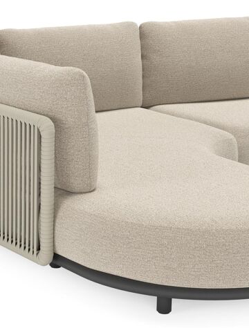 Salon de jardin d'angle Lomano en aluminium noir et corde luxe plate tissée verticalement beige et coussins en all weather cosytica Catania Greige | Exterioo