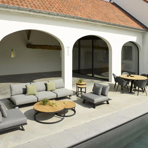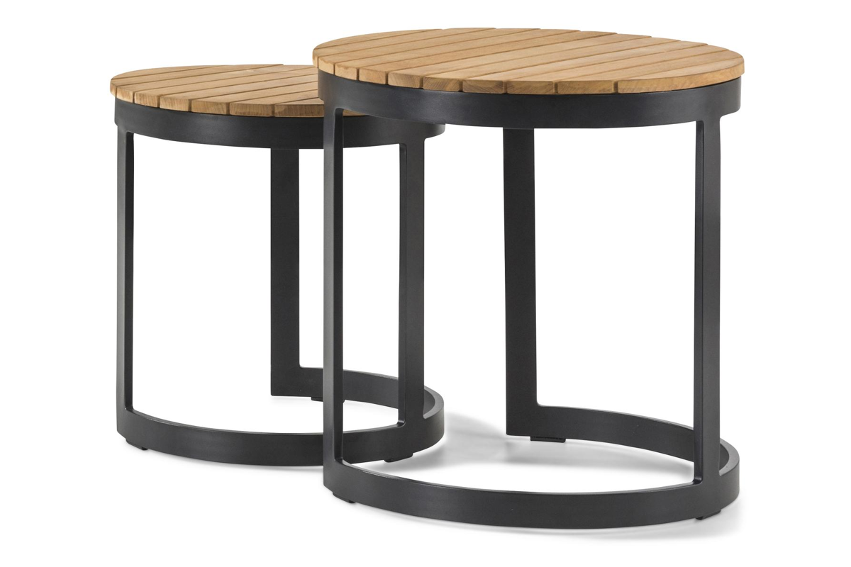 L'ensemble de deux tables d'appoint rondes Enna sera un complément parfait à votre salon de jardin. Les tables sont en aluminium inoxydable de qualité supérieure et sont dotées d'un plateau en teck. Vous pouvez les utiliser individuellement, mais aussi en ensemble. La petite table peut être glissée entièrement sous la grande table.