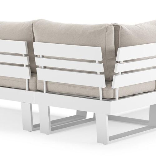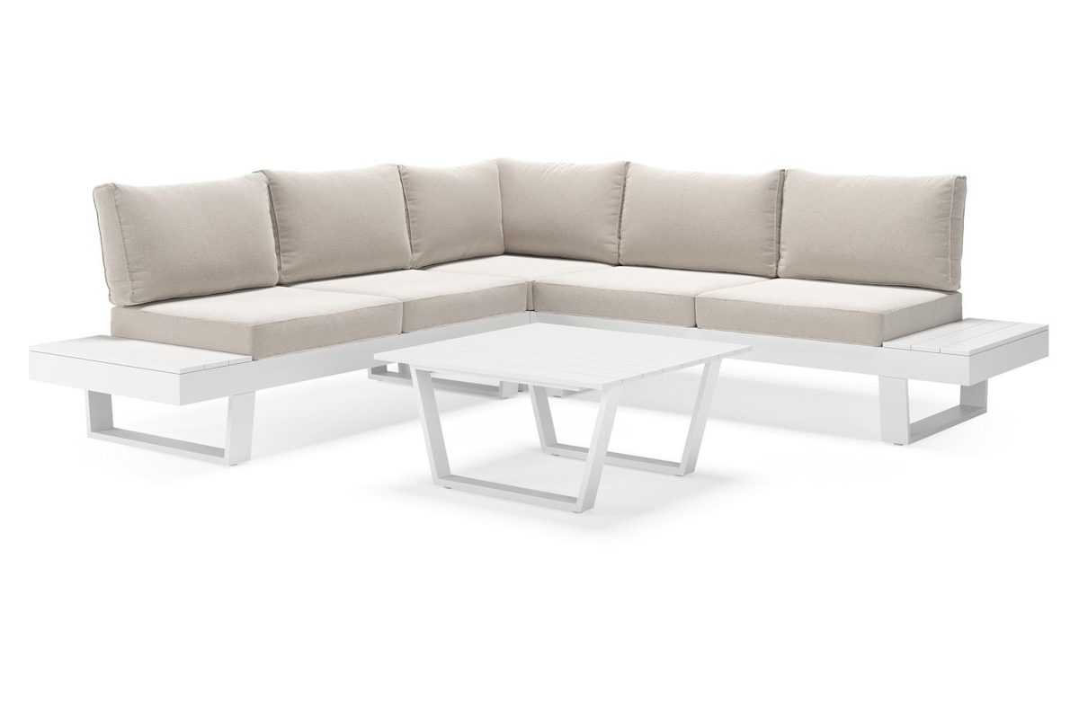De Alora lounge heeft een strak, minimalistisch design met een robuust frame en een trapeziumvormig onderstel dat direct een moderne uitstraling toevoegt aan je buitenruimte. De geïntegreerde zijtafels bieden handige extra ruimte voor drankjes en accessoires, zodat je alles bij de hand hebt tijdens een ontspannen middag. De loungekussens zijn inbegrepen en gemaakt uit Weather+ Softtouch. Deze kussens hebben een olefin stof en, waardoor ze zacht aanvoelen en vuilafstotend zijn. Weather+ Softtouch kussens zijn beperkt waterafstotend en hebben één laag standaard schuimkussen in een waterbestendige binnenhoes. In de winter of bij langdurige regen bewaar je de kussens best binnen.