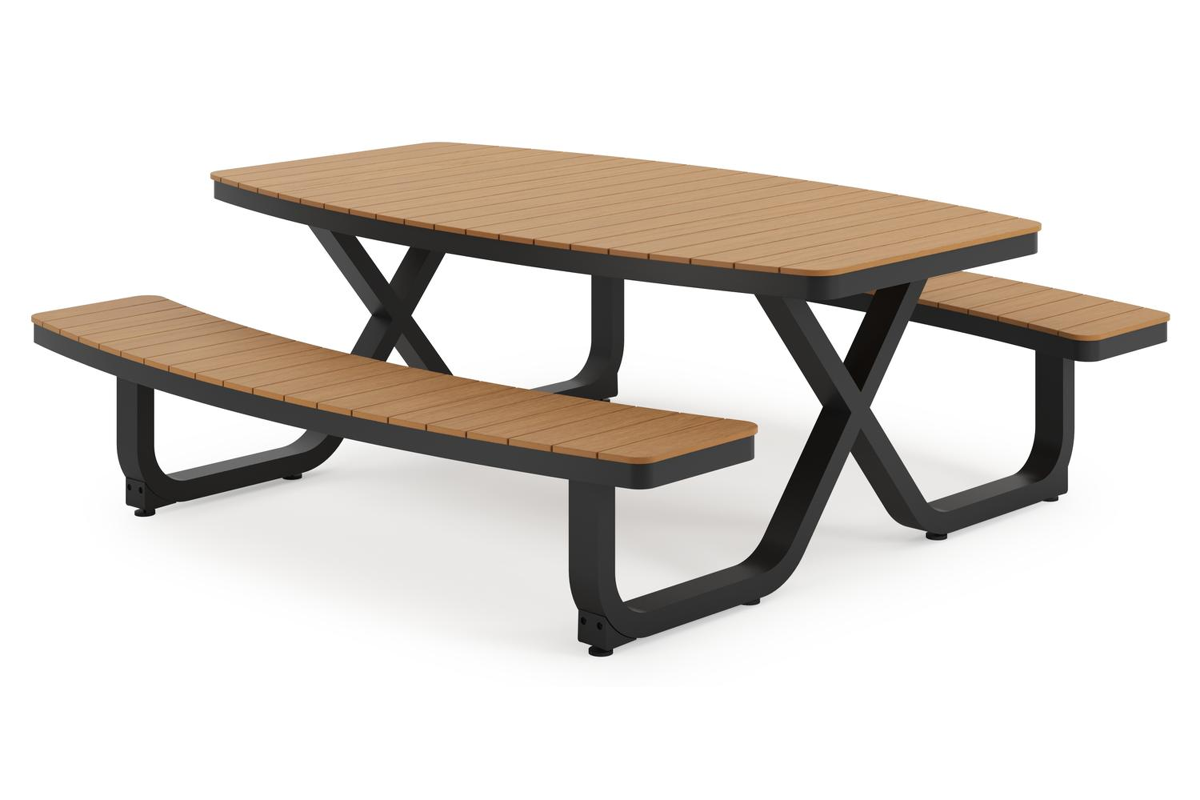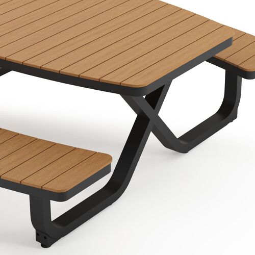 De Alora picknicktafel heeft een modern ontwerp met vloeiende, gebogen lijnen die zorgen voor een uitnodigende uitstraling. De afgeronde hoeken van zowel het tafelblad als de banken geven het geheel een zachte, eigentijdse look. Het frame van de tafel is gemaakt uit roestvrij aluminium, een sterk, maar toch licht materiaal dat makkelijk verplaatsbaar is. Het oppervlak is glad afgewerkt waardoor het geen vuil aantrekt en onderhoudsvriendelijk is. De poedercoating zorgt voor de UV- en weerbestendigheid van je meubel.Een tafelblad uit polywood heeft de look van hout, maar is eigenlijk kunststof. Je geniet van de charmante uitstraling van hout, maar het barst of scheurt niet en behoudt jarenlang zijn unieke bruine houtlook.