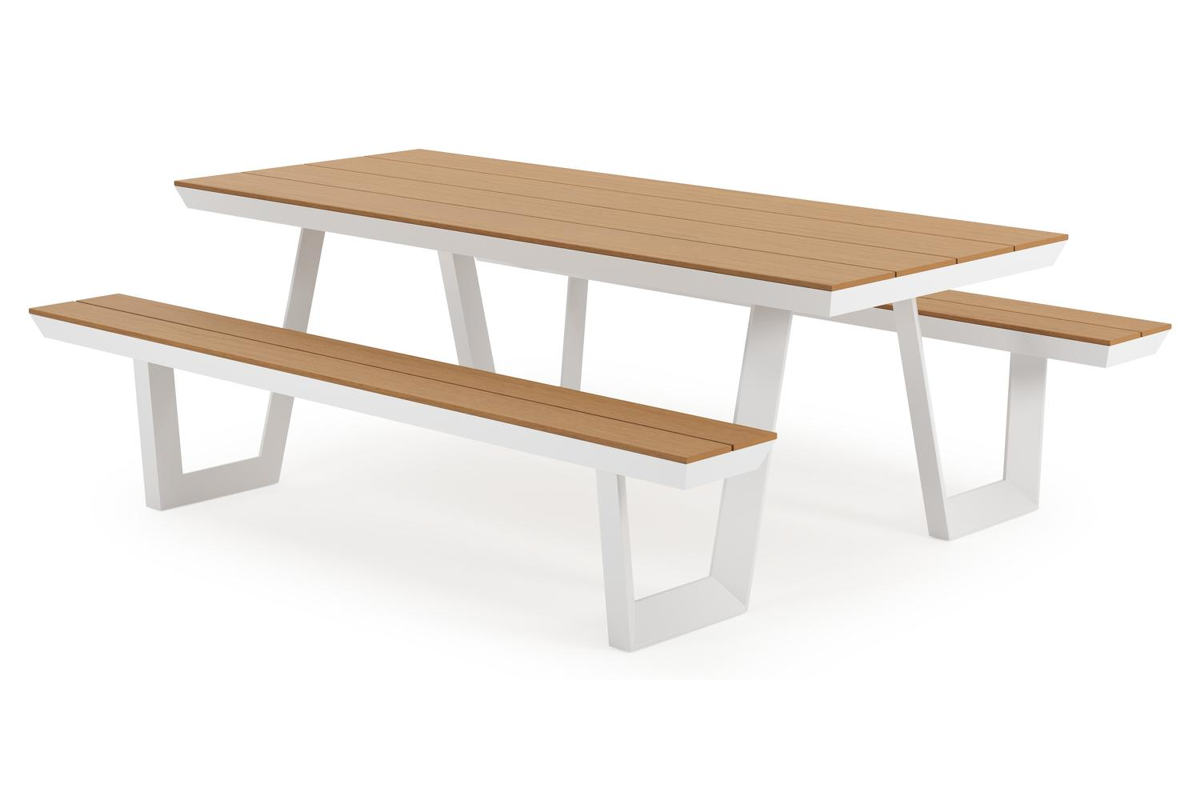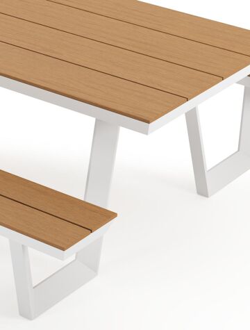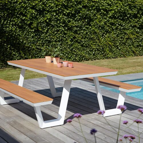 De Altura picknicktafel heeft een moderne en gezellige uitstraling. Het frame is gemaakt uit roestvrij aluminium, een stevig en licht materiaal. Je kan de picknicktafel makkelijk herkennen door zijn typisch afgeschuinde randen. Daarnaast beschikt de picknicktafel ook over een lage instap, waardoor het makkelijk is om te zitten. Het tafelblad is afgewerkt in polywood. Let wel: polywood is een synthetisch materiaal. Intensieve warmte kan het materiaal wel beschadigen - zoals zonlicht dat door glazen valt. Gebruik daarom altijd een onderzetter of dienblad. Met de Altura picknicktafel geniet je van geweldige buitenmomenten aan een scherpe prijs.