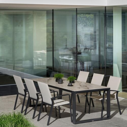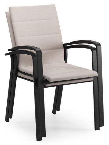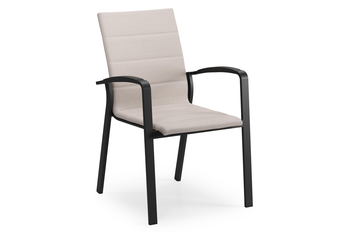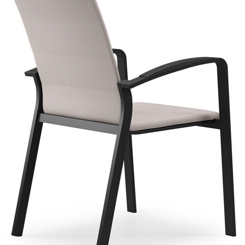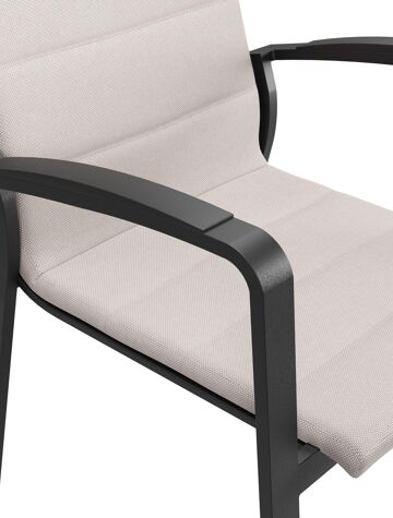 Textilene is een bekleding die bestaat uit polyester draden met een pvc-coating. Textilene is een weerbestendig, vormvast en sneldrogend materiaal. Dankzij de open structuur is het een ademende bekleding en de elasticiteit garandeert een geweldig zitcomfort. De samenstelling maakt het tevens een erg duurzaam materiaal. Luxe textilene omgeeft het zitvlak en de rugleuning om een gedetailleerde afwerking te garanderen. Daarnaast is de afwerking compleet met de elegante siernaden. Tussen de lagen textilene is er een sneldrogende schuimlaag.
