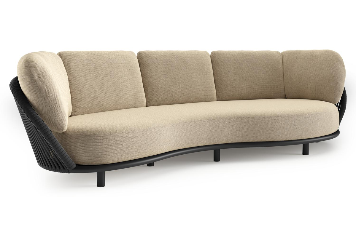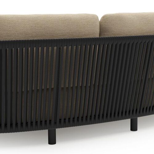 Lupino loungebank in zwart aluminium en zwart verticaal geweven luxe vlakke brede rope met althea camel all weather cosytica kussen | Exterioo