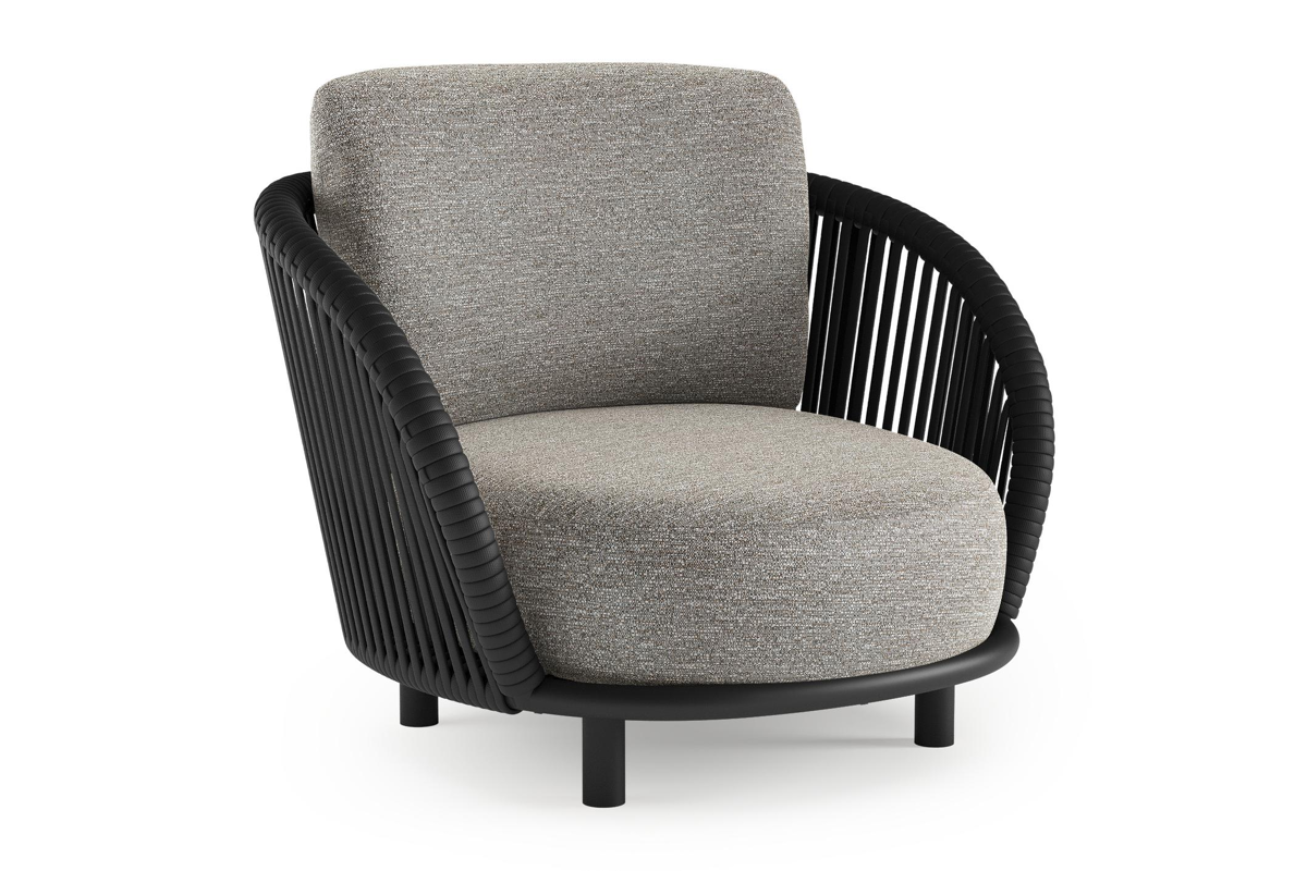 Lupino loungestoel in zwart aluminium en zwart verticaal geweven luxe vlakke brede rope met tundra pepper all weather sunbrella® luxe kussen | Exterioo