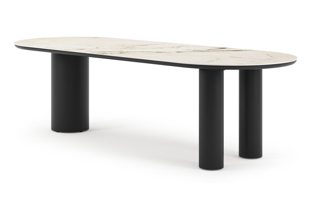 De Organo tuintafel onderscheidt zich door zijn uniek ontwerp, met een organisch gevormd tafelblad dat een eigentijdse uitstraling heeft. De tafel rust op een robuuste, dikke ronde poot en twee fijne ronde poten. Samen creëren ze een meesterlijke balans tussen luxe en moderniteit, waardoor deze tafel het pronkstuk van je buitenruimte wordt.