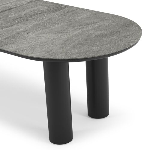 De Organo tuintafel onderscheidt zich door zijn uniek ontwerp, met een organisch gevormd tafelblad dat een eigentijdse uitstraling heeft. De tafel rust op een robuuste, dikke ronde poot en twee fijne ronde poten. Samen creëren ze een meesterlijke balans tussen luxe en moderniteit, waardoor deze tafel het pronkstuk van je buitenruimte wordt.