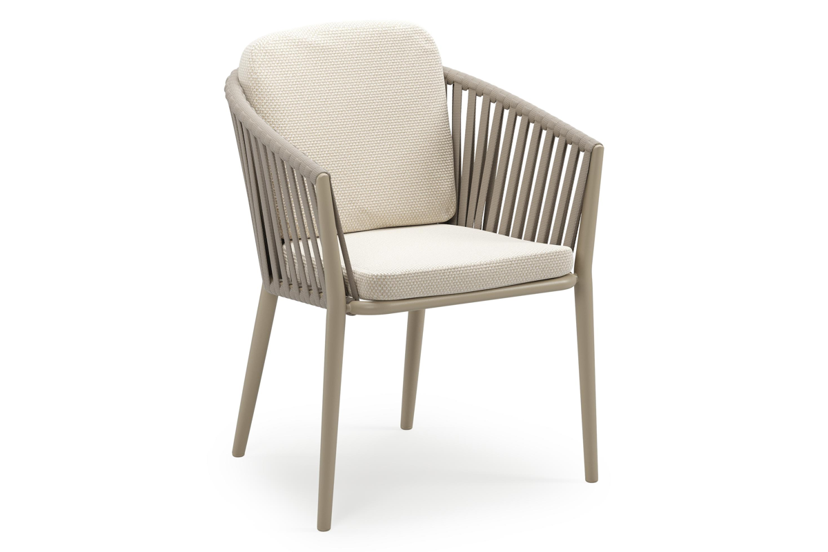 Orso stapelbare tuinstoel in beige aluminium en beige verticaal geweven luxe vlakke brede rope met stoelkussen in All Weather Cosytica Althea Off White | Exterioo
