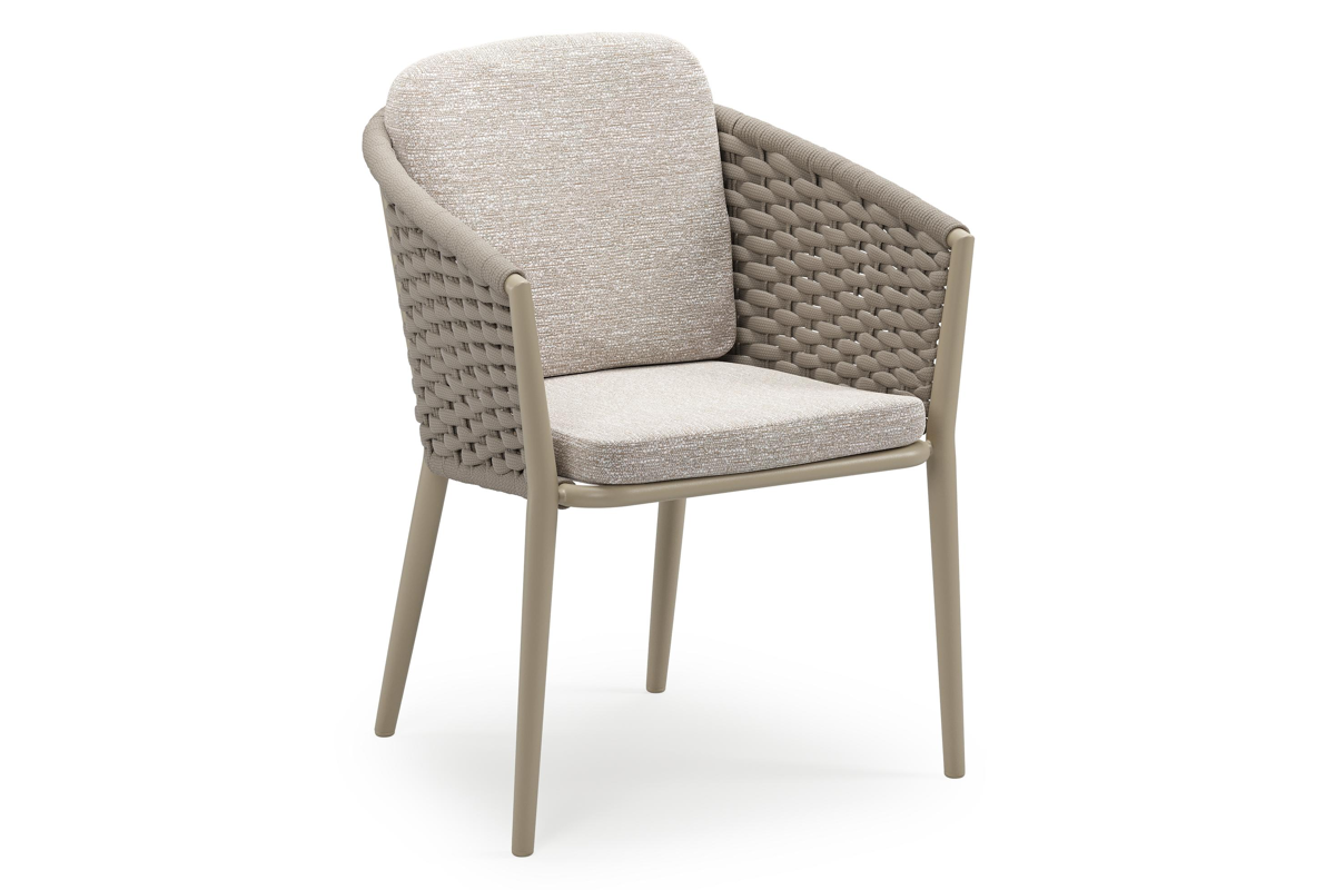 Orso stapelbare tuinstoel in beige aluminium en beige horizontaal geweven ronde rope met stoelkussen in All Weather Sunbrella® Luxe Tundra Sand | Exterioo