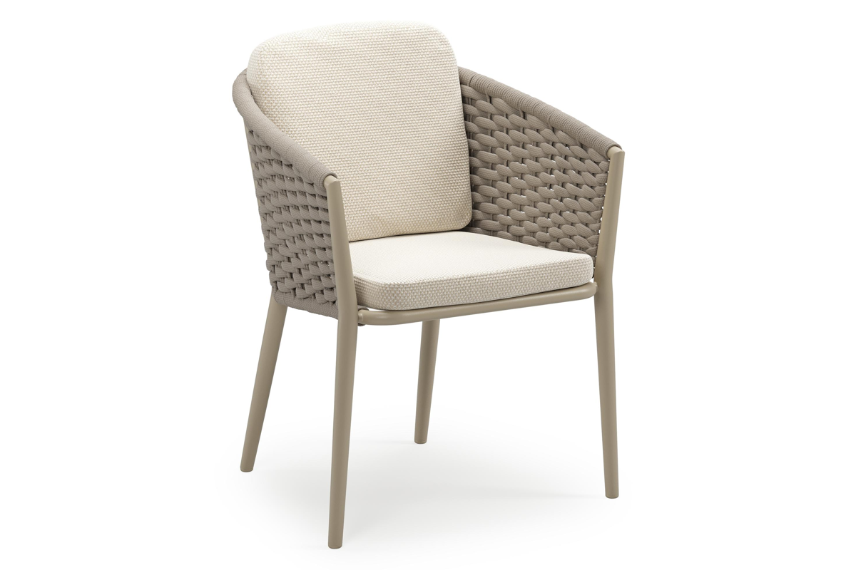 Orso stapelbare tuinstoel in beige aluminium en beige horizontaal geweven ronde rope met stoelkussen in All Weather Cosytica Althea Off White | Exterioo