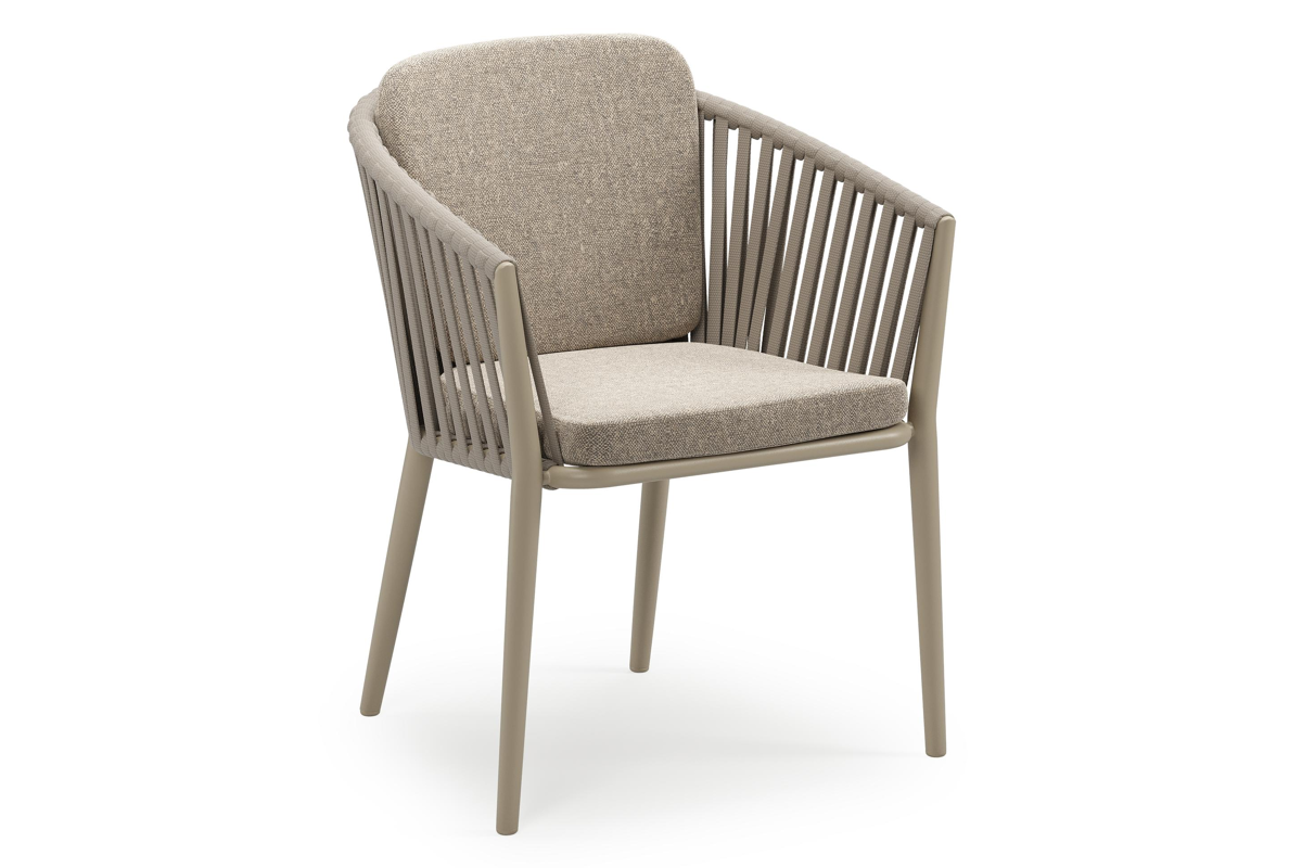 Orso stapelbare tuinstoel in beige aluminium en beige verticaal geweven luxe vlakke brede rope met stoelkussen in All Weather Sunbrella® Luxe Chartres Pewter | Exterioo