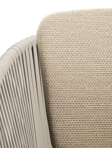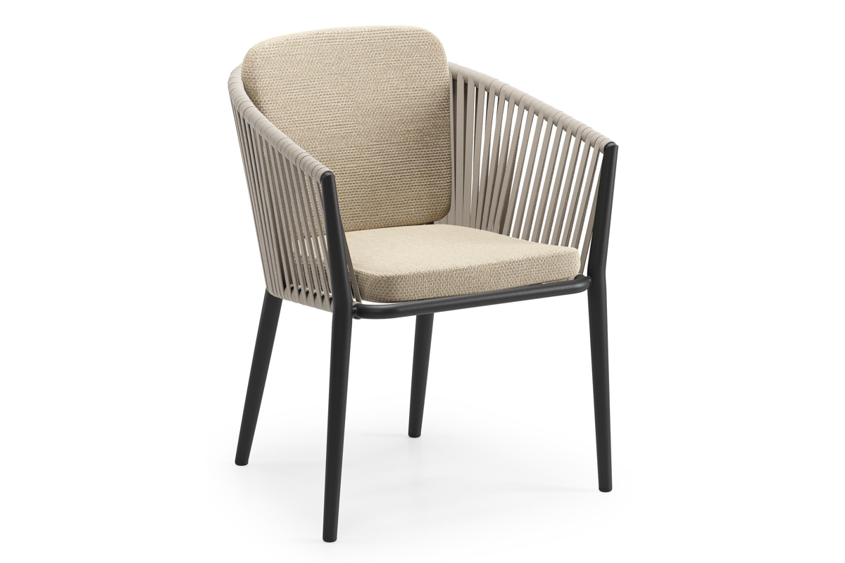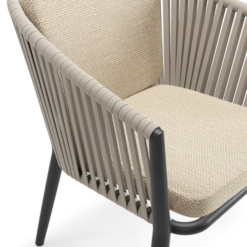Orso tuinstoel in zwart aluminium en beige verticaal geweven vlakke rope met zitkussen in All Weather Cosytica Althea Camel | Exterioo