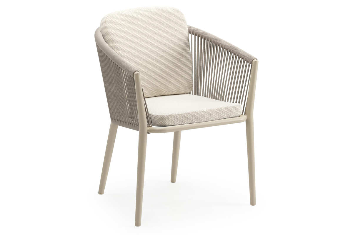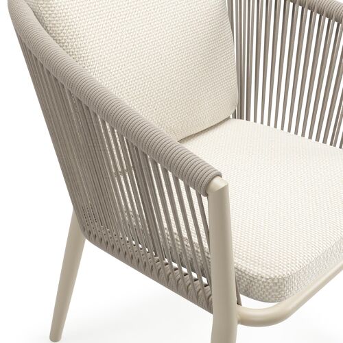 Orso tuinstoel in beige aluminium en beige verticaal geweven ronde rope met luxe zitkussen in All Weather Cosytica Althea Off White | Exterioo