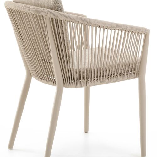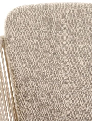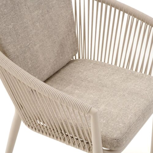 Orso stapelbare tuinstoel in beige aluminium en beige verticaal geweven ronde rope met kussen in All Weather Sunbrella® Luxe Chartres Pewter | Exterioo