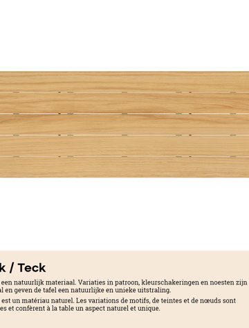 Een tafelblad uit teak staat gelijk aan bijzondere kwaliteit en natuurlijk design. Teak is een kwalitatieve houtsoort gekenmerkt door zijn hardheid. Aangezien hout leeft, kan de structuur of kleur licht anders zijn dan op het beeld weergegeven.