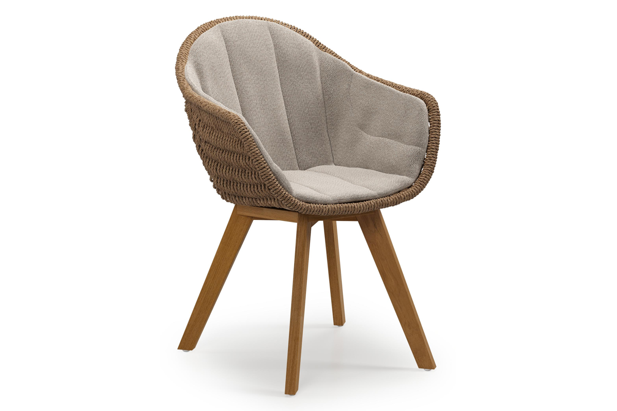 Pagino tuinstoel in teak en bruin ronde wicker met zitkussen in All Weather Sunbrella® Luxe Savane Coconut | Exterioo