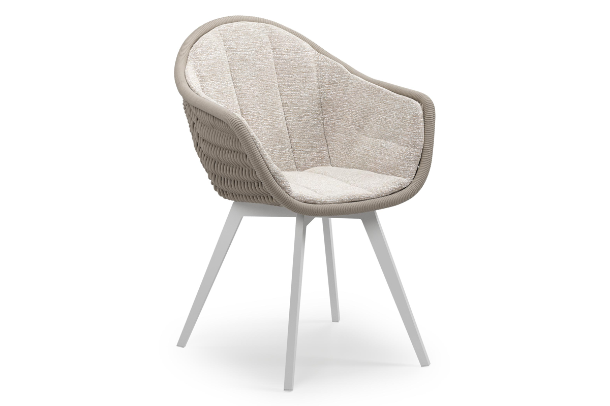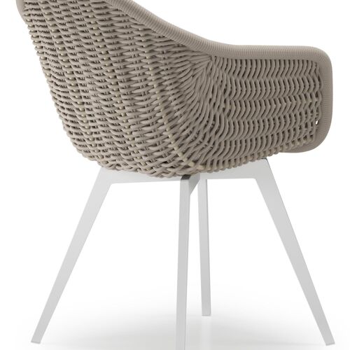 Pagino tuinstoel in wit aluminium en beige verticaal geweven ronde rope met zitkussen in All Weather Sunbrella® Luxe Tundra Sand | Exterioo