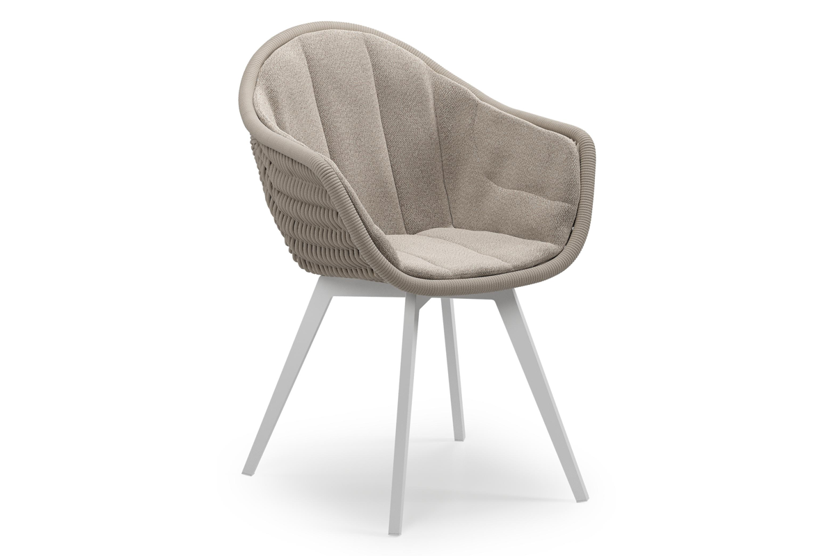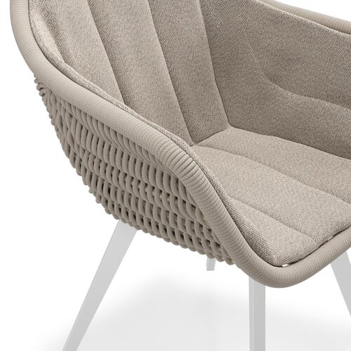 Pagino tuinstoel in wit aluminium en beige verticaal geweven ronde rope met zitkussen in All Weather Sunbrella® Luxe Savane Coconut | Exterioo