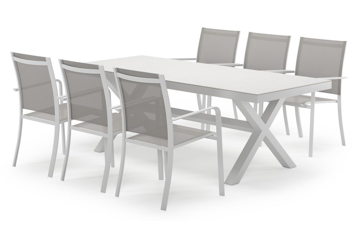 De Reza tuinset heeft een uitzonderlijke kruispoot en een stevig, dik frame waarin het tafelblad geplaatst is. In het midden van de tafel loopt een balk als extra ondersteuning van het frame.