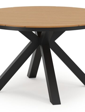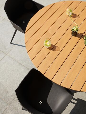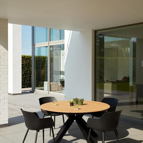 Tora tuinset is een collectie met ronde tafels. De kenmerkende kruispoot splitst zich onder het frame uit in vier gespreide poten, wat zorgt voor extra stabiliteit.