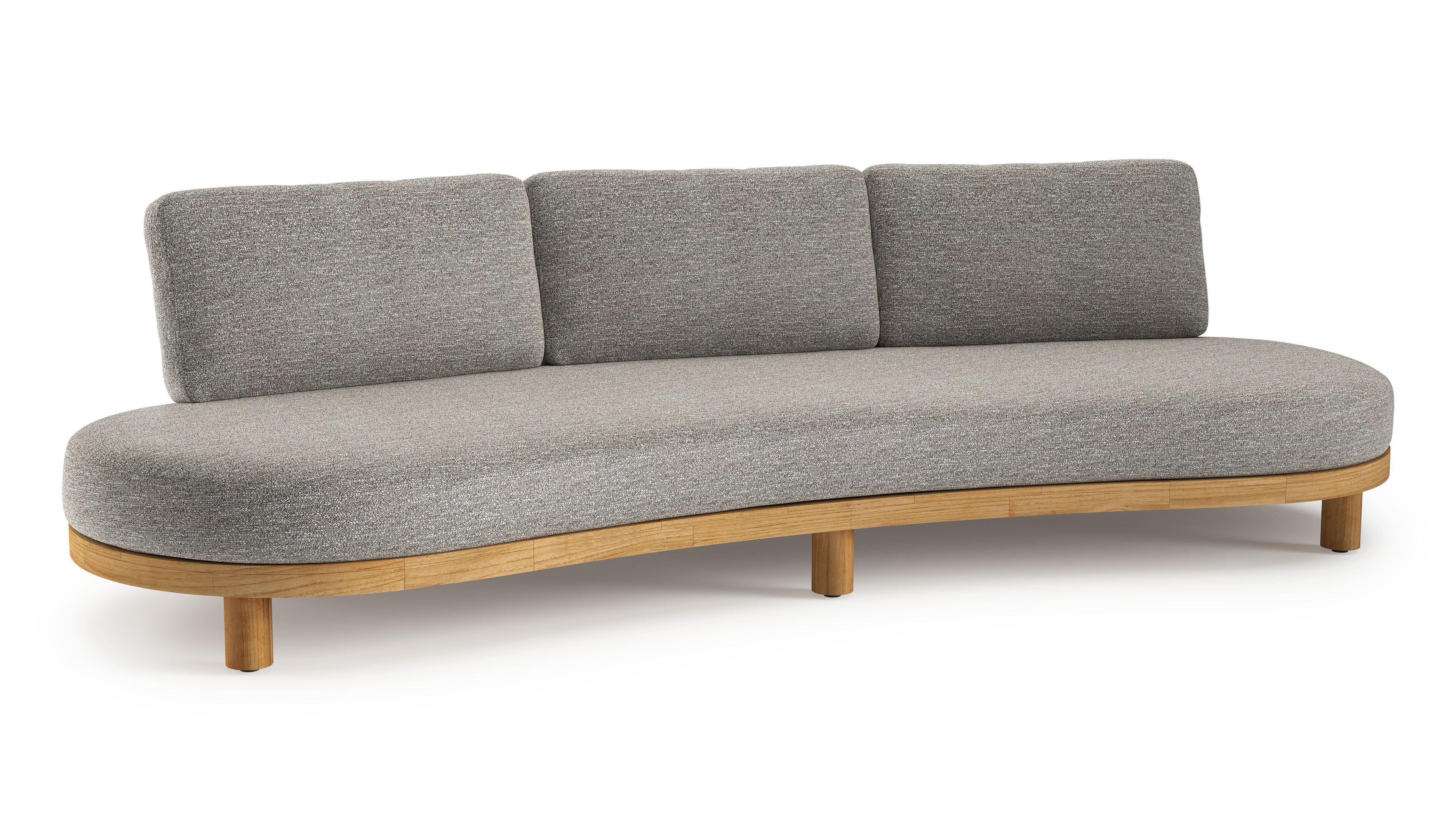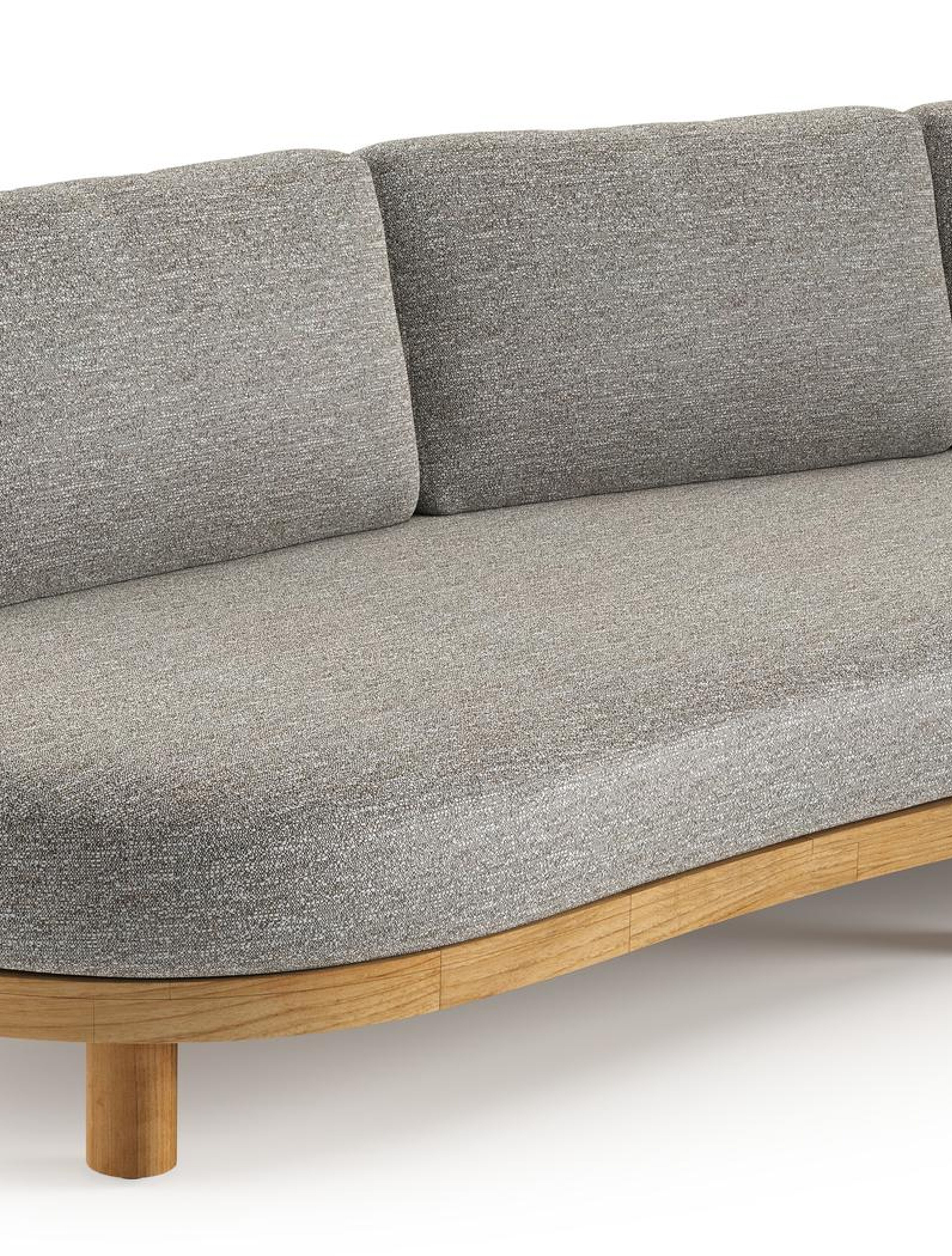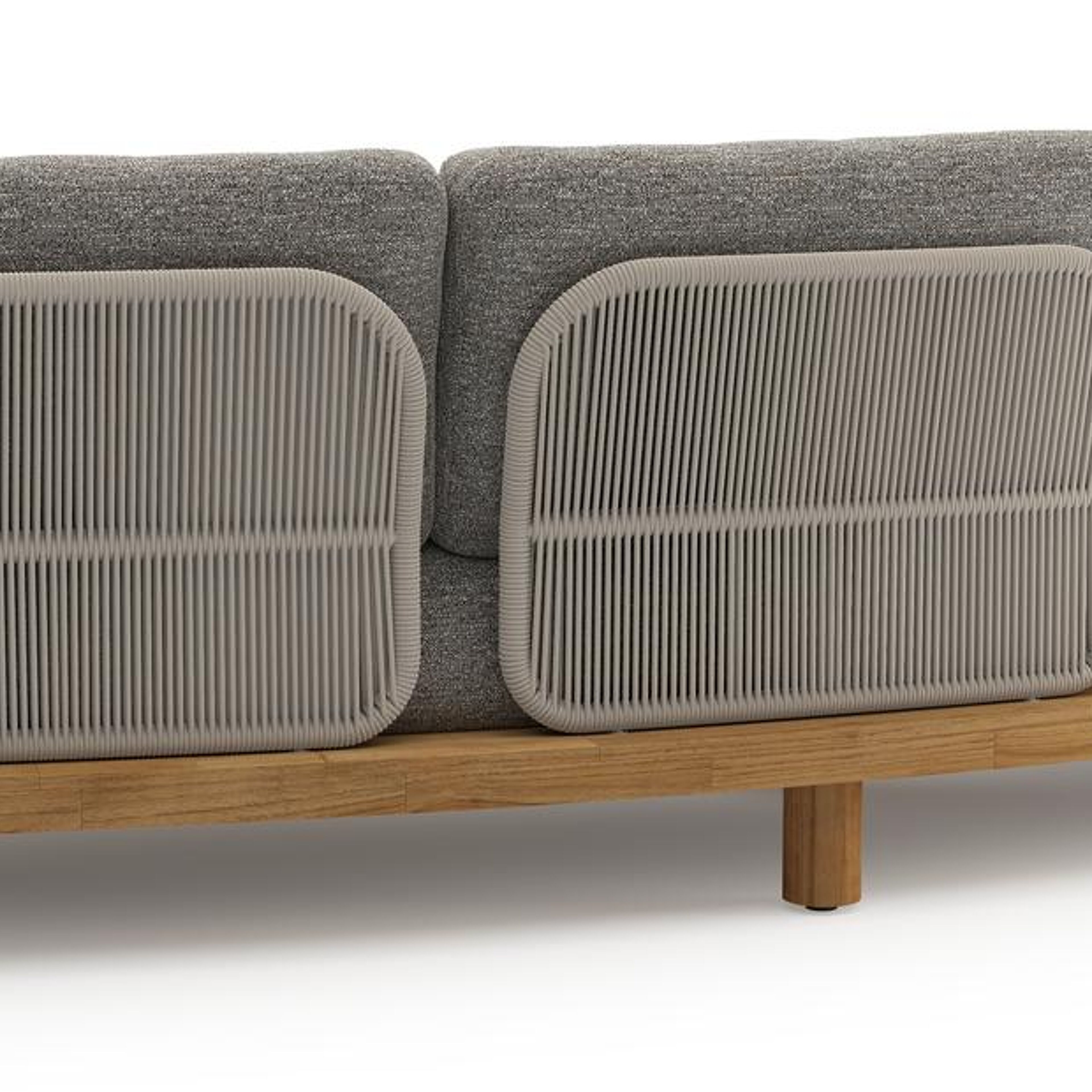 Canapé de jardin Donato en teck et corde ronde tissée verticalement beige et coussins en all weather sunbrella® luxe Tundra Pepper | Exterioo mobilier de jardin