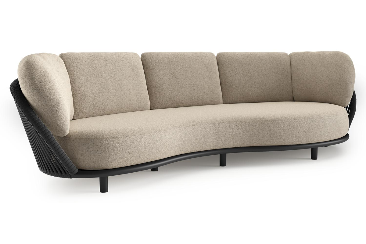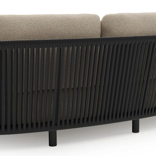 Canapé de jardin Lupino en aluminium noir et corde large plate de luxe tissée verticalement noir et coussins en all weather cosytica marbella beige | Exterioo
