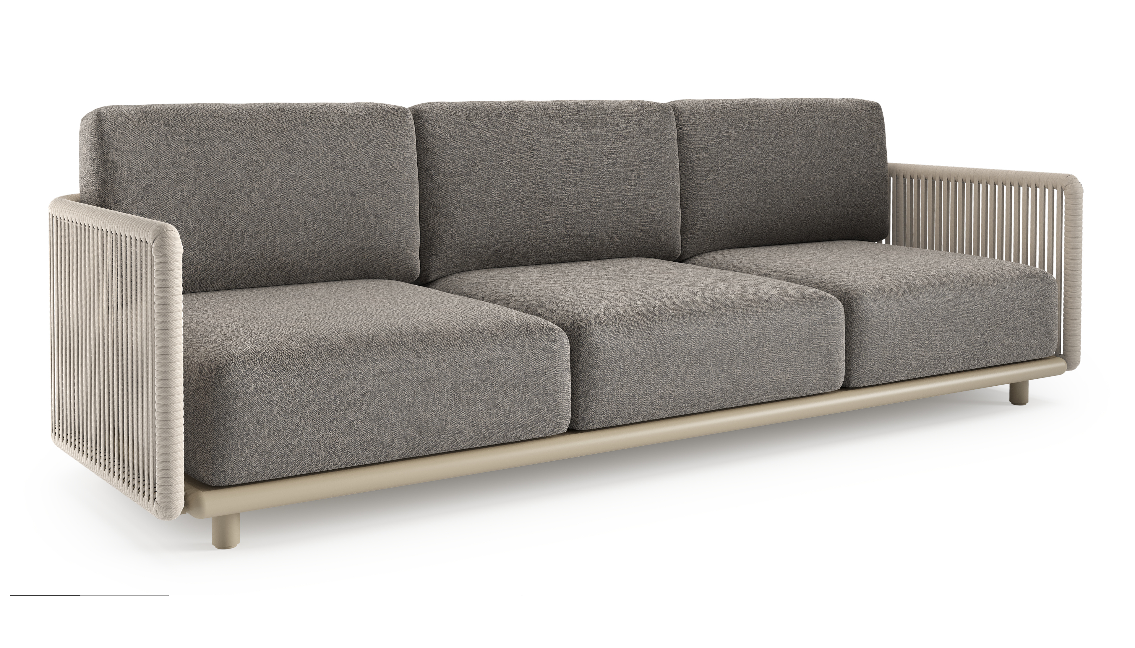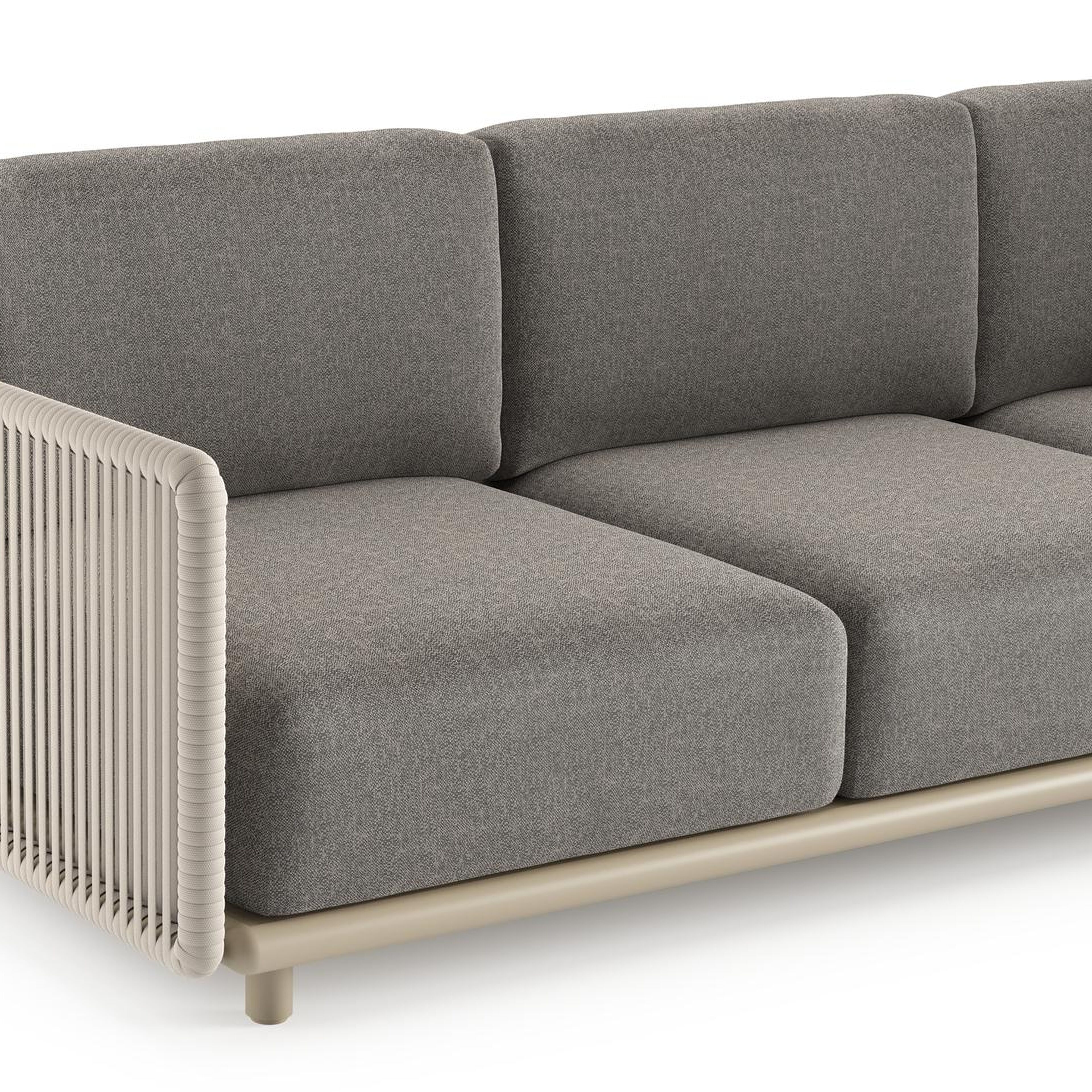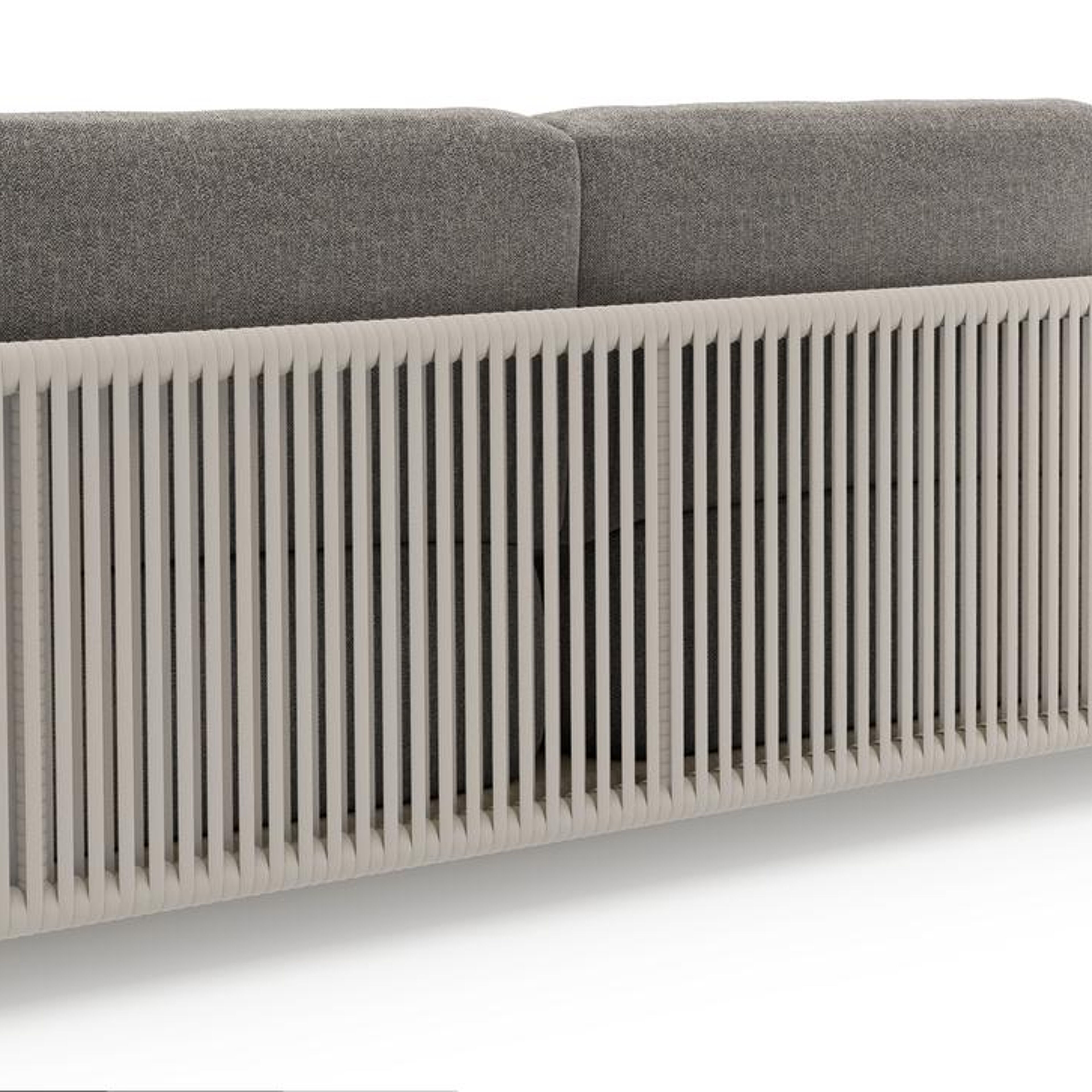 Canapé de jardin Organo en aluminium beige et corde luxe plate tissée verticalement beige et coussin en all weather Sunbrella® luxe chartres drizzle | Exterioo mobilier de jardin