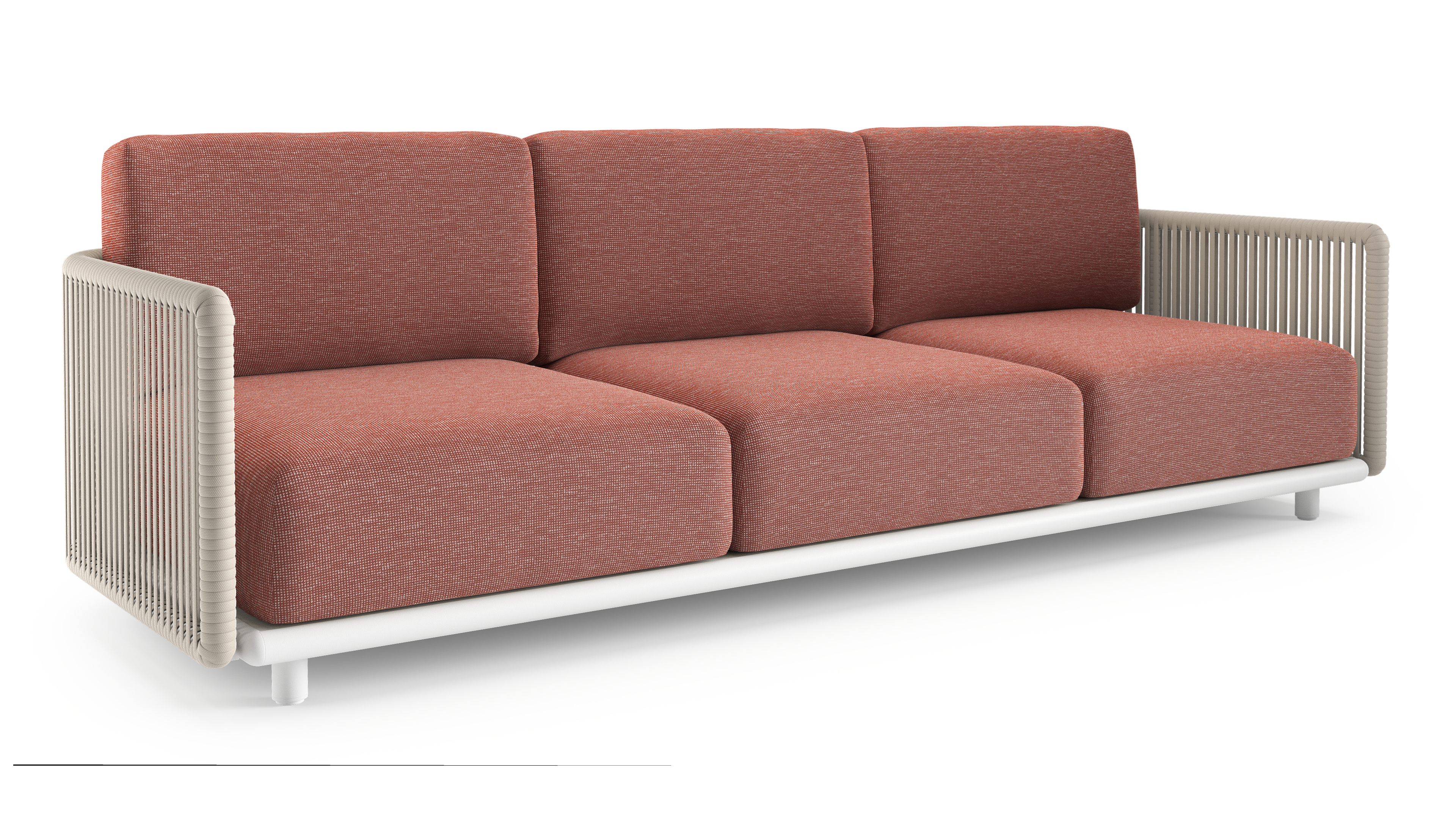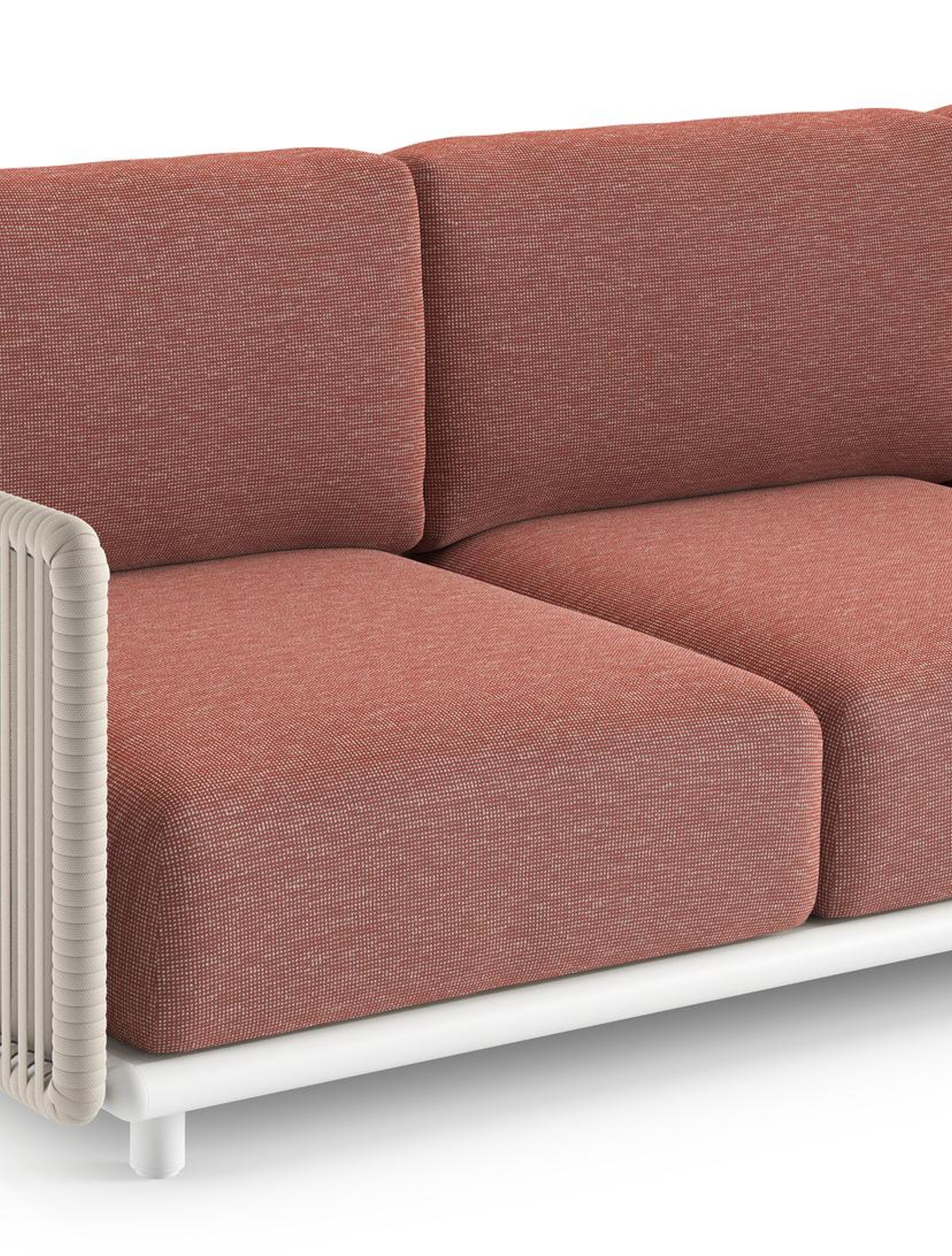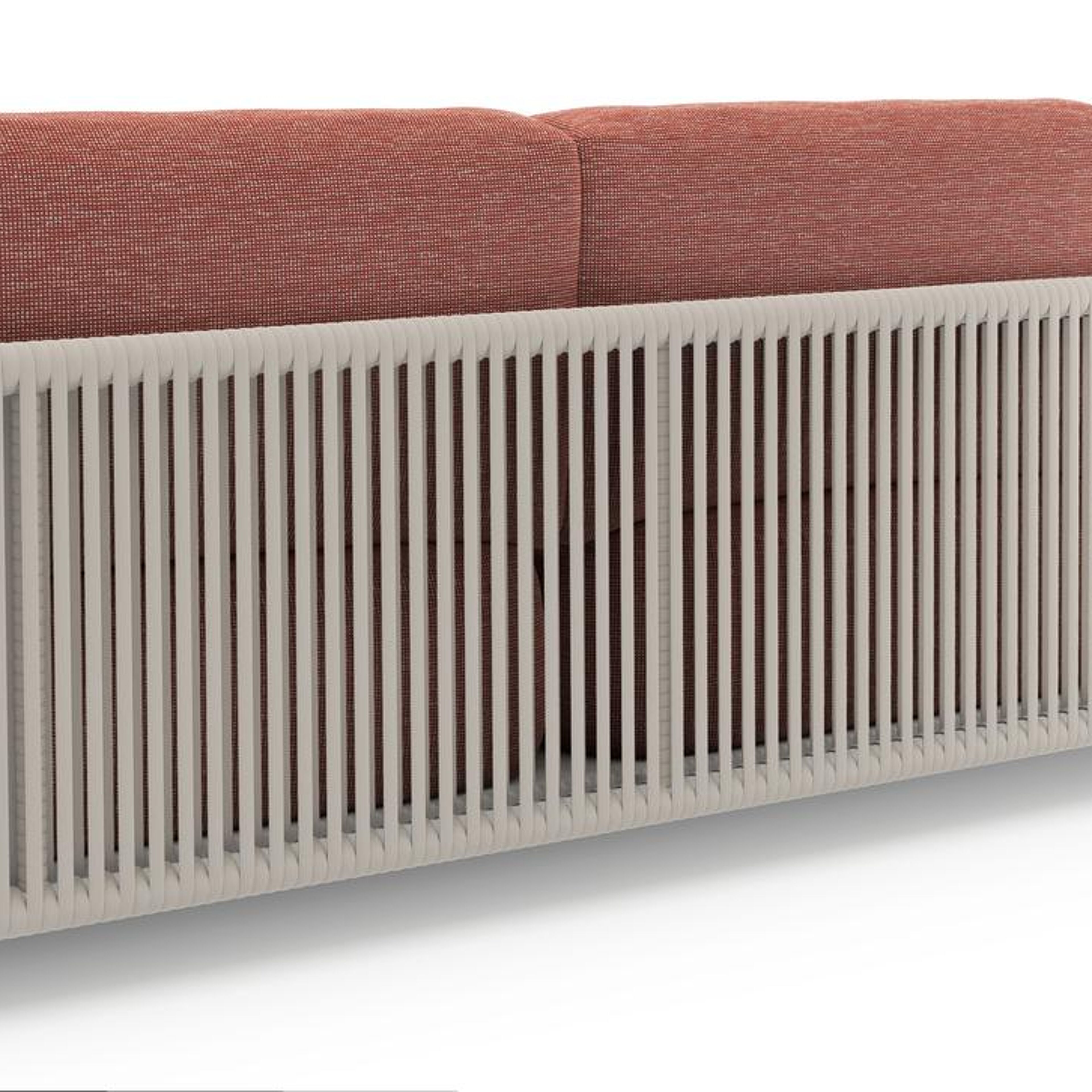 Canapé de jardin Organo en aluminium blanc et corde luxe plate tissée verticalement beige et coussin en all weather Sunbrella® luxe slow alezan | Exterioo mobilier de jardin