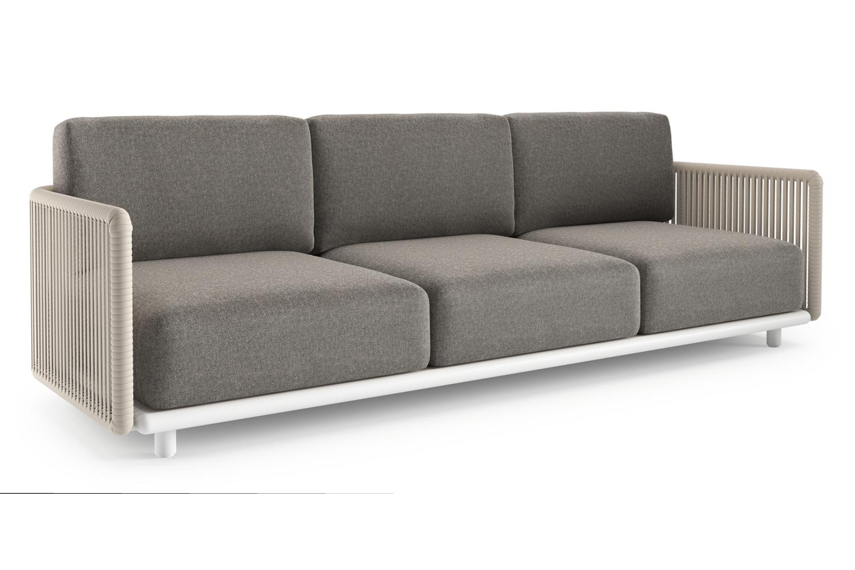 Canapé de jardin Organo en aluminium blanc et corde luxe plate tissée verticalement beige et coussin en all weather Sunbrella® luxe chartres drizzle | Exterioo