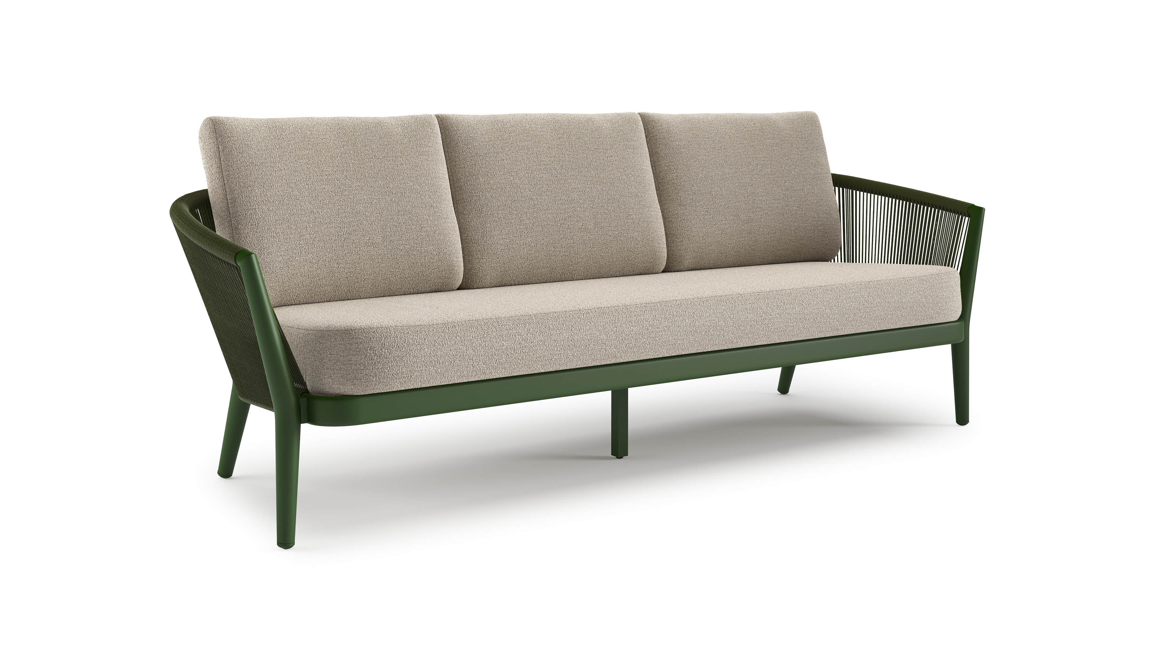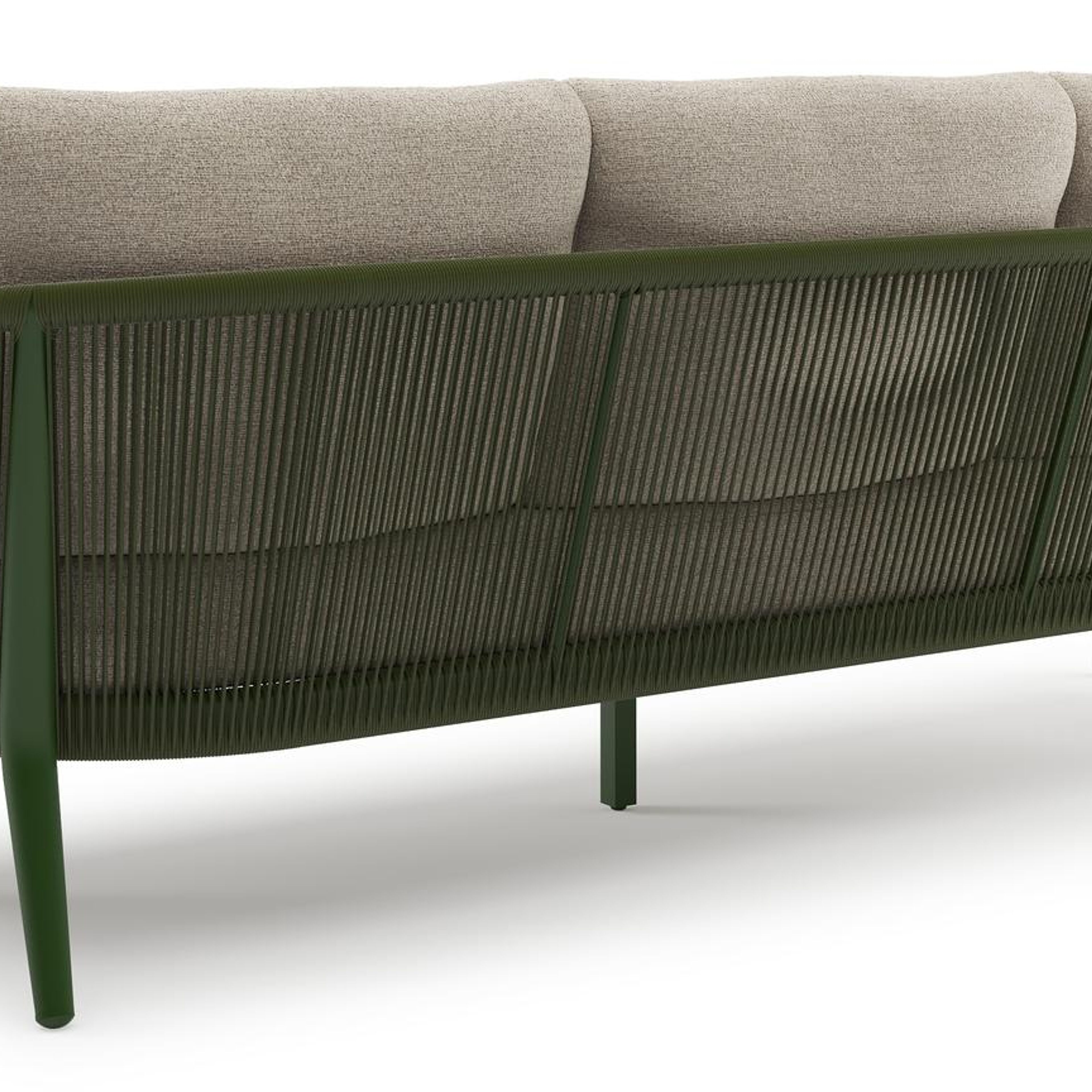 Canapé de jardin Orso en aluminium vert en corde ronde tissée verticalement vert et coussins en all weather cosytica Catania Greige | Exterioo mobilier de jardin