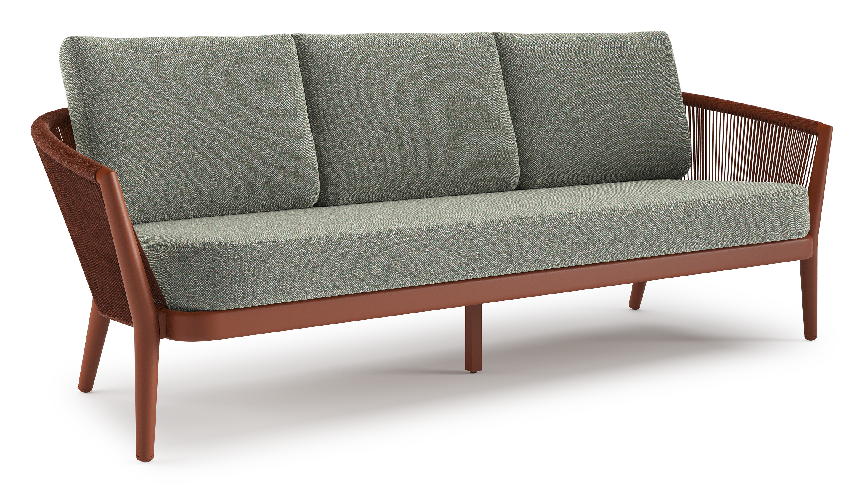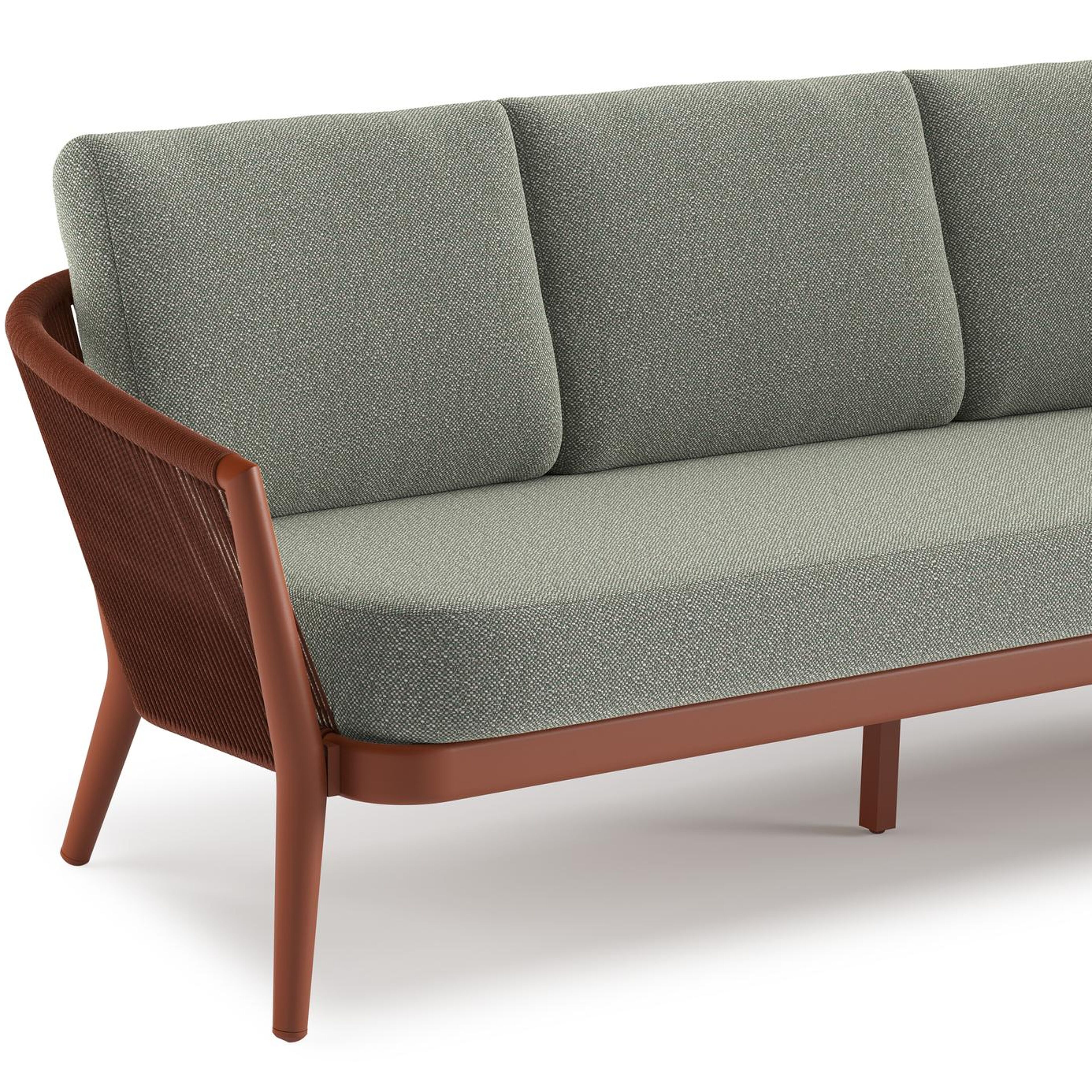 Canapé de jardin Orso en aluminium brun rouille en corde ronde tissée verticalement brun rouille et coussins en all weather sunbrella® luxe Savane Leaf | Exterioo mobilier de jardin