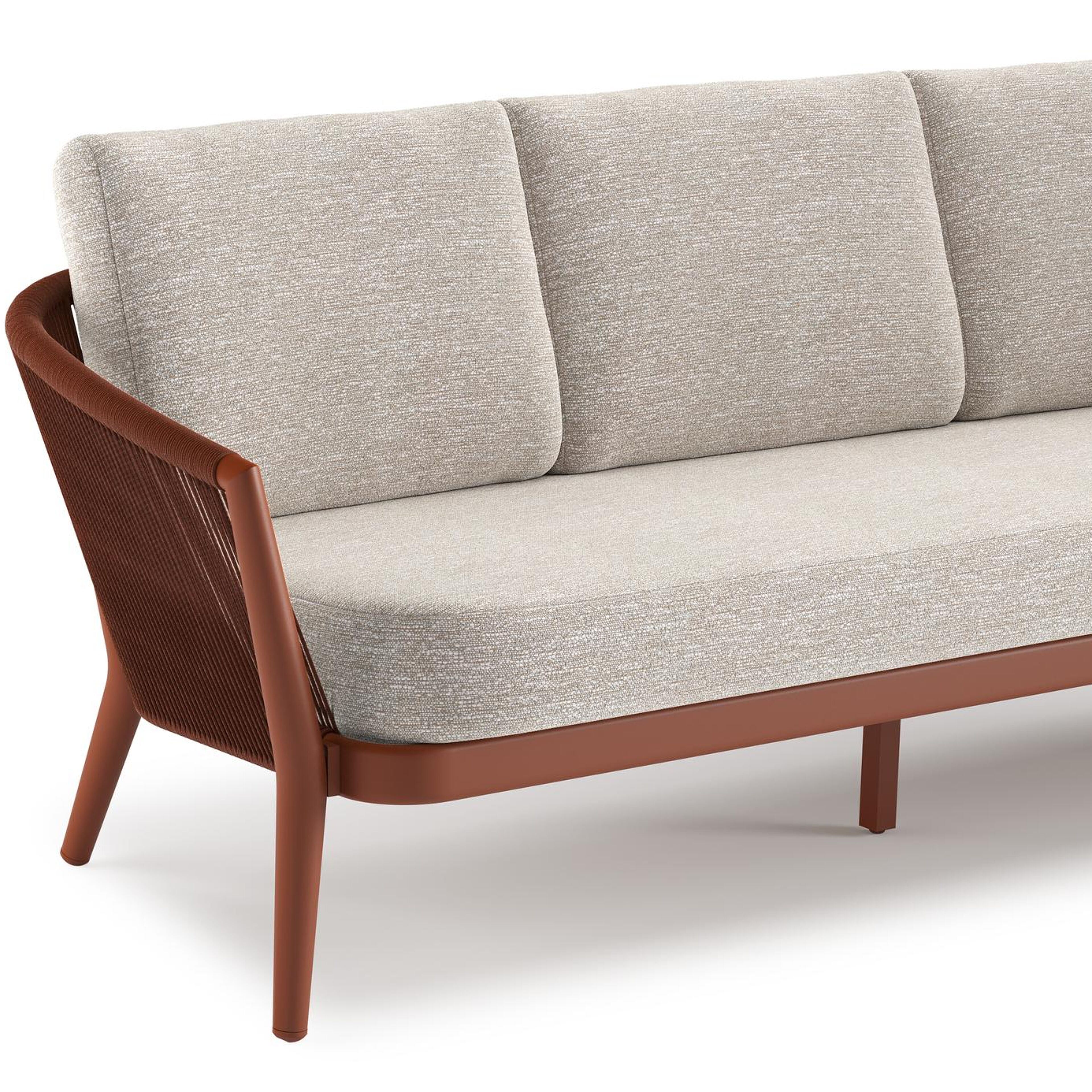 Canapé de jardin Orso en aluminium brun rouille en corde ronde tissée verticalement brun rouille et coussins en all weather sunbrella® luxe Tundra Sand | Exterioo mobilier de jardin