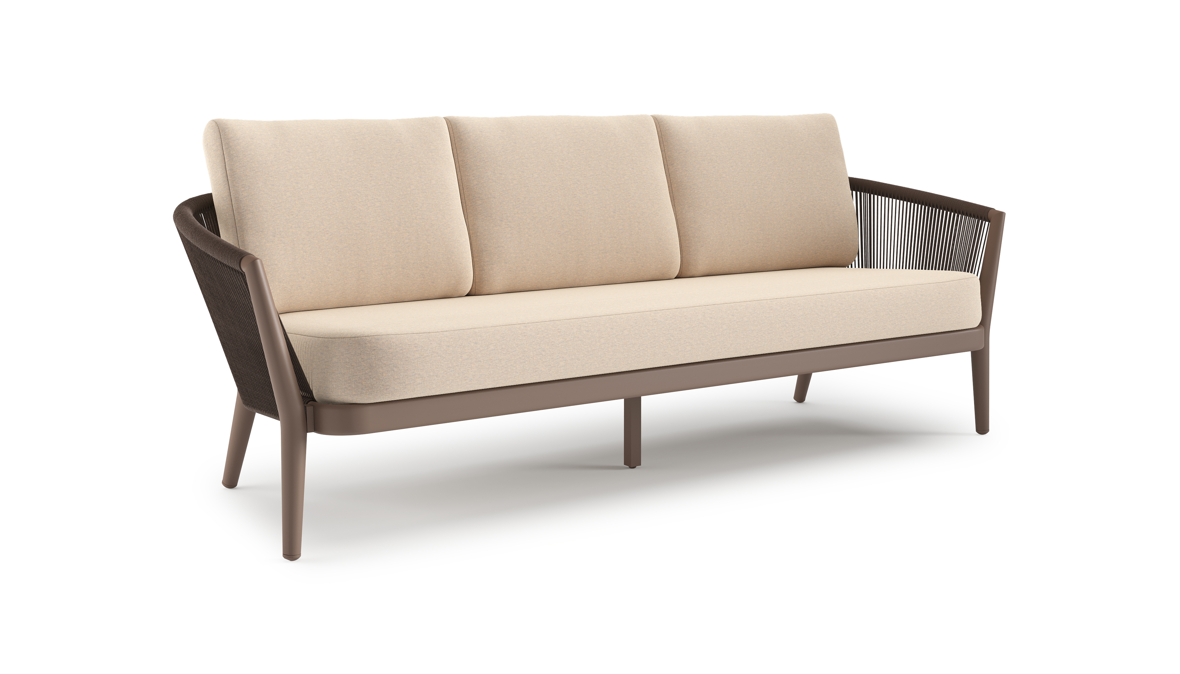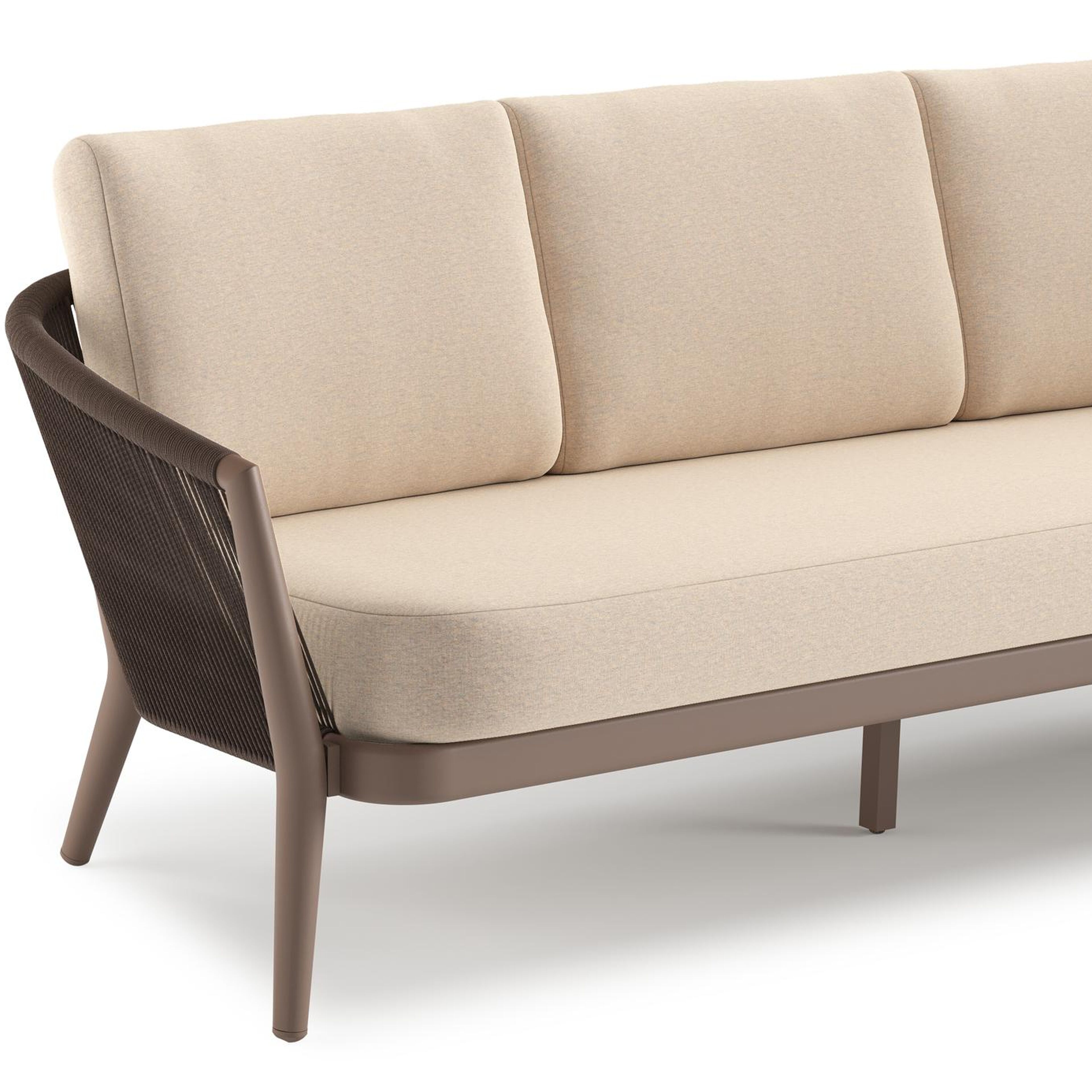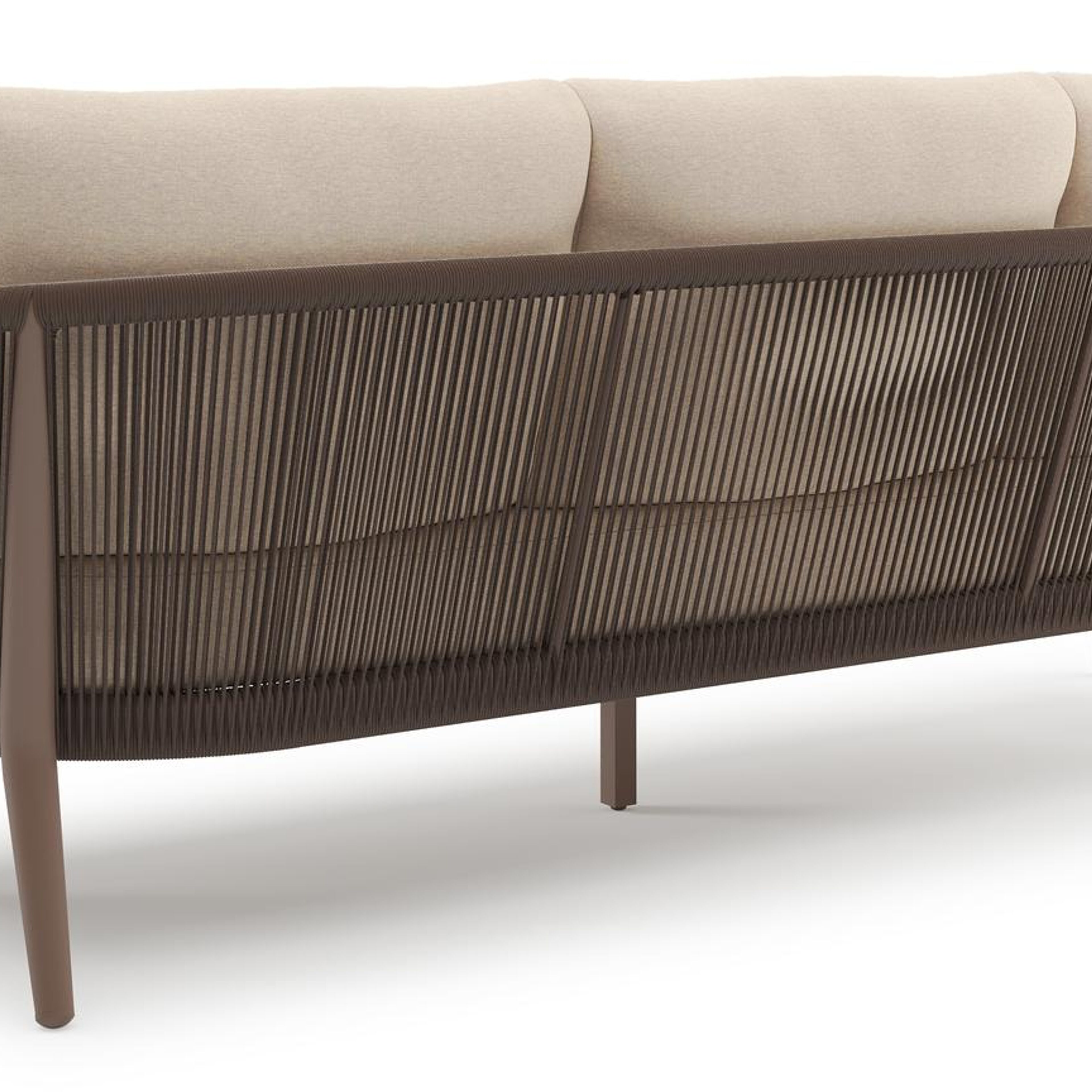 Canapé de jardin Orso en aluminium taupe en corde ronde tissée verticalement noir et coussins en all weather sunbrella® luxe Heritage Papyrus | Exterioo mobilier de jardin