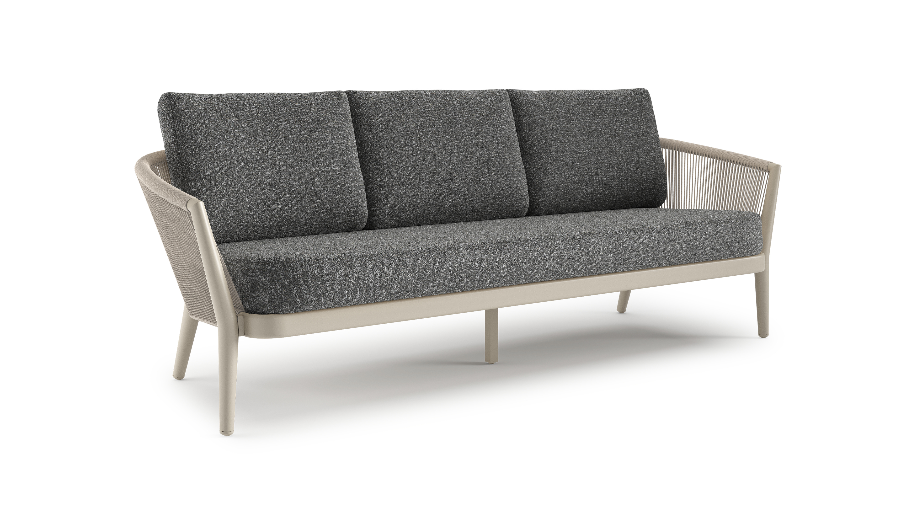 Canapé de jardin Orso en aluminium beige en corde ronde tissée verticalement beige et coussins en all weather cosytica Catania Black | Exterioo mobilier de jardin