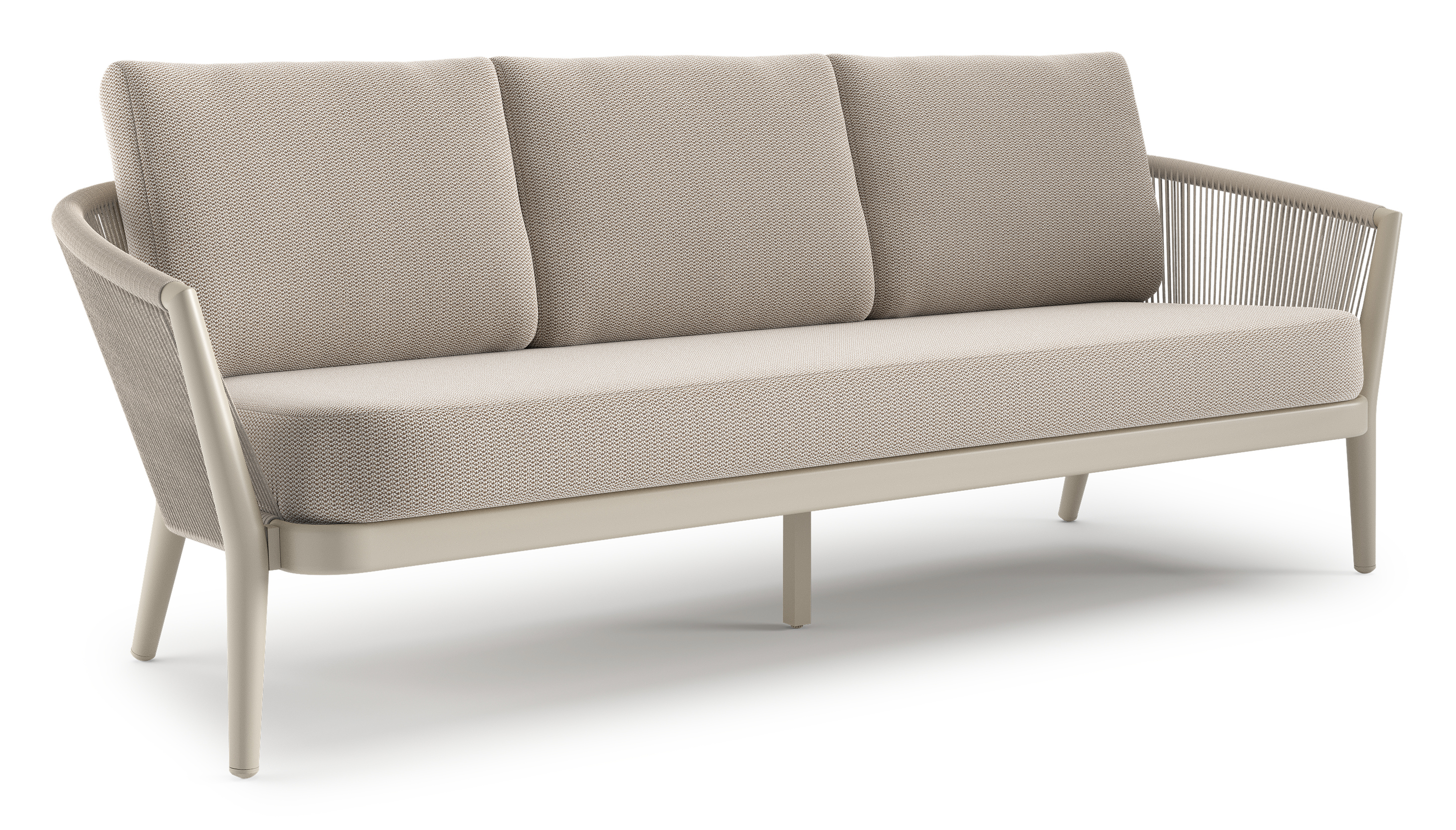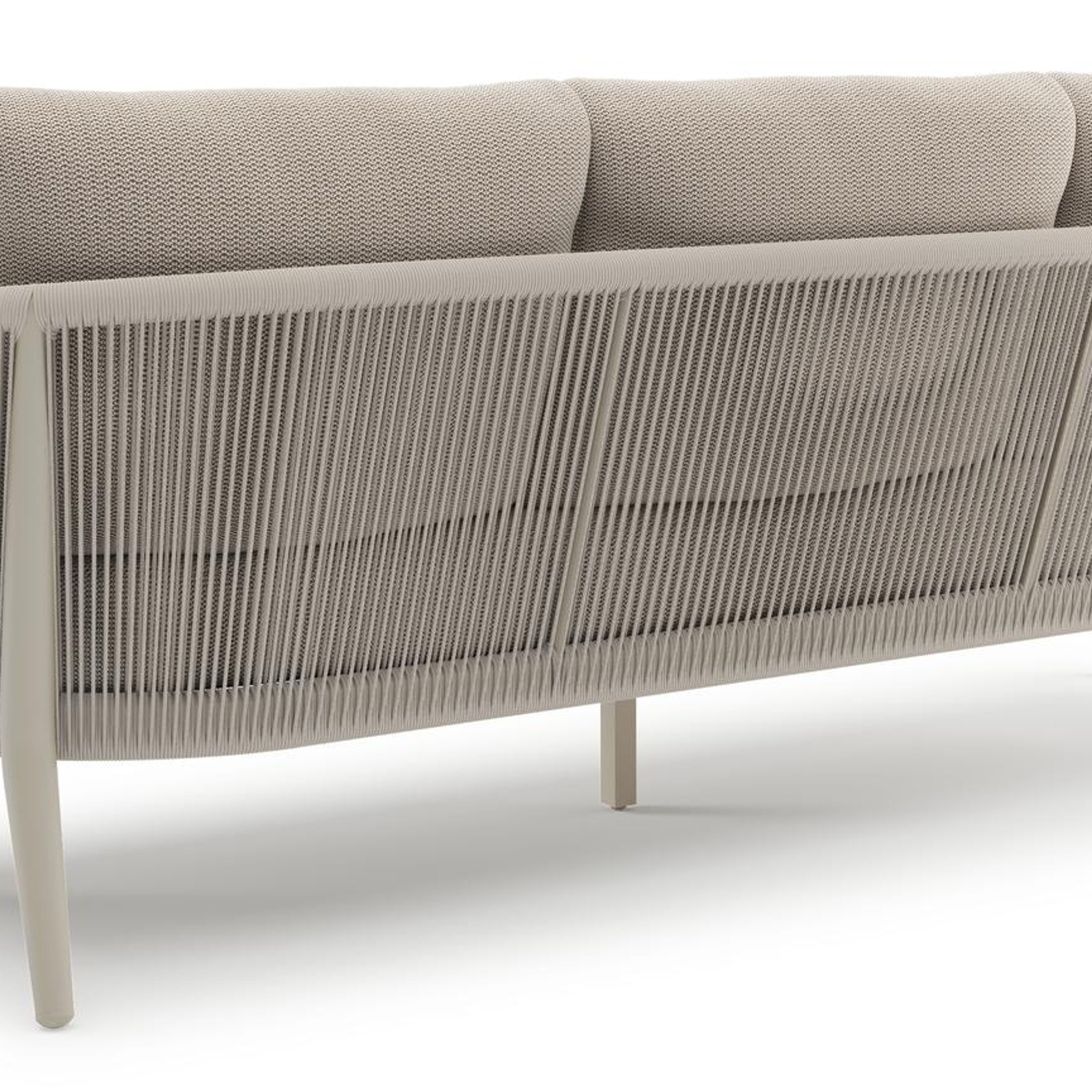 Canapé de jardin Orso en aluminium beige en corde ronde tissée verticalement beige et coussins en all weather sunbrella® luxe Lopi Fossil | Exterioo mobilier de jardin