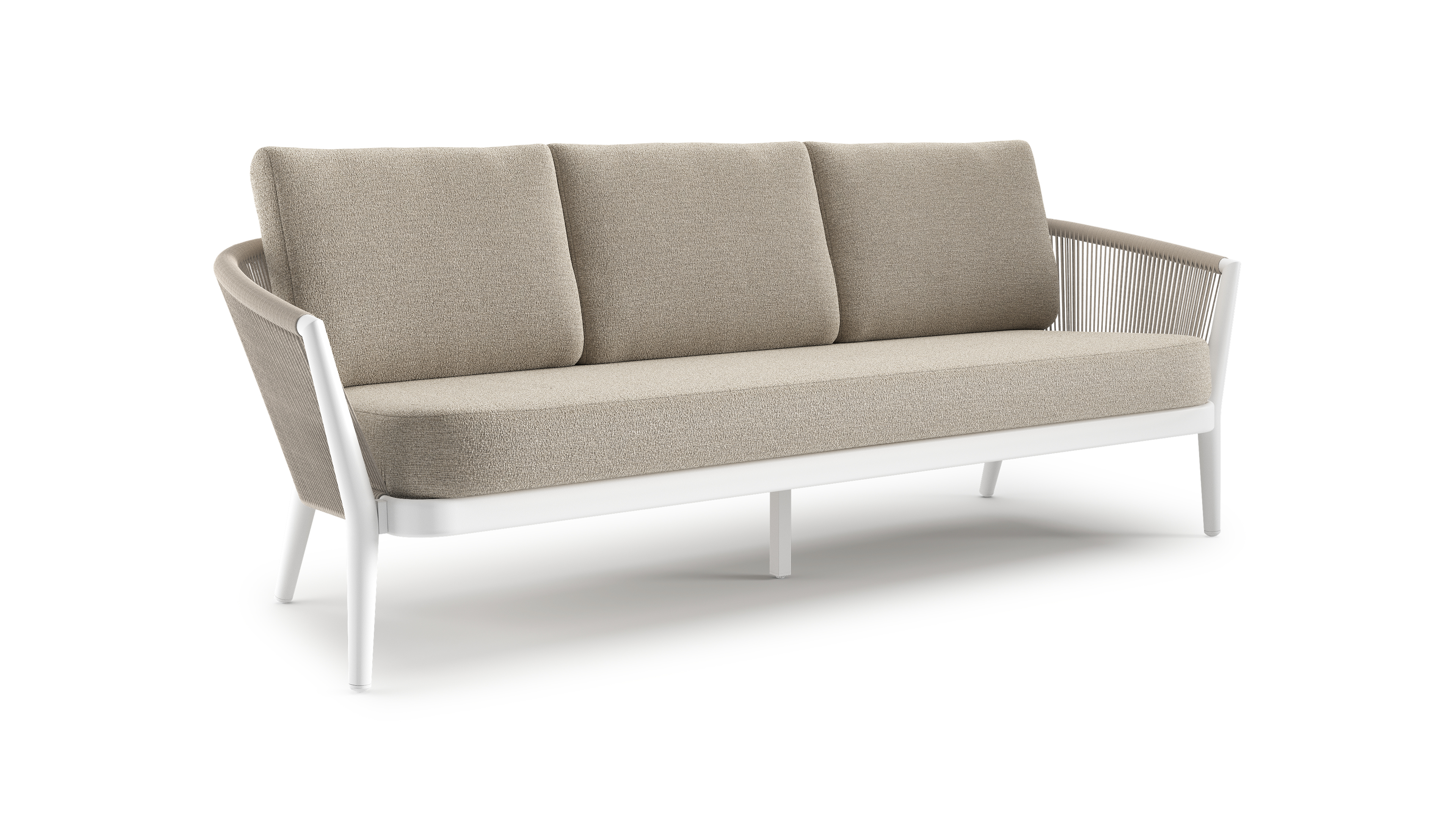 Canapé de jardin Orso en aluminium blanc en corde ronde tissée verticalement beige et coussins en all weather cosytica Catania Greige | Exterioo mobilier de jardin