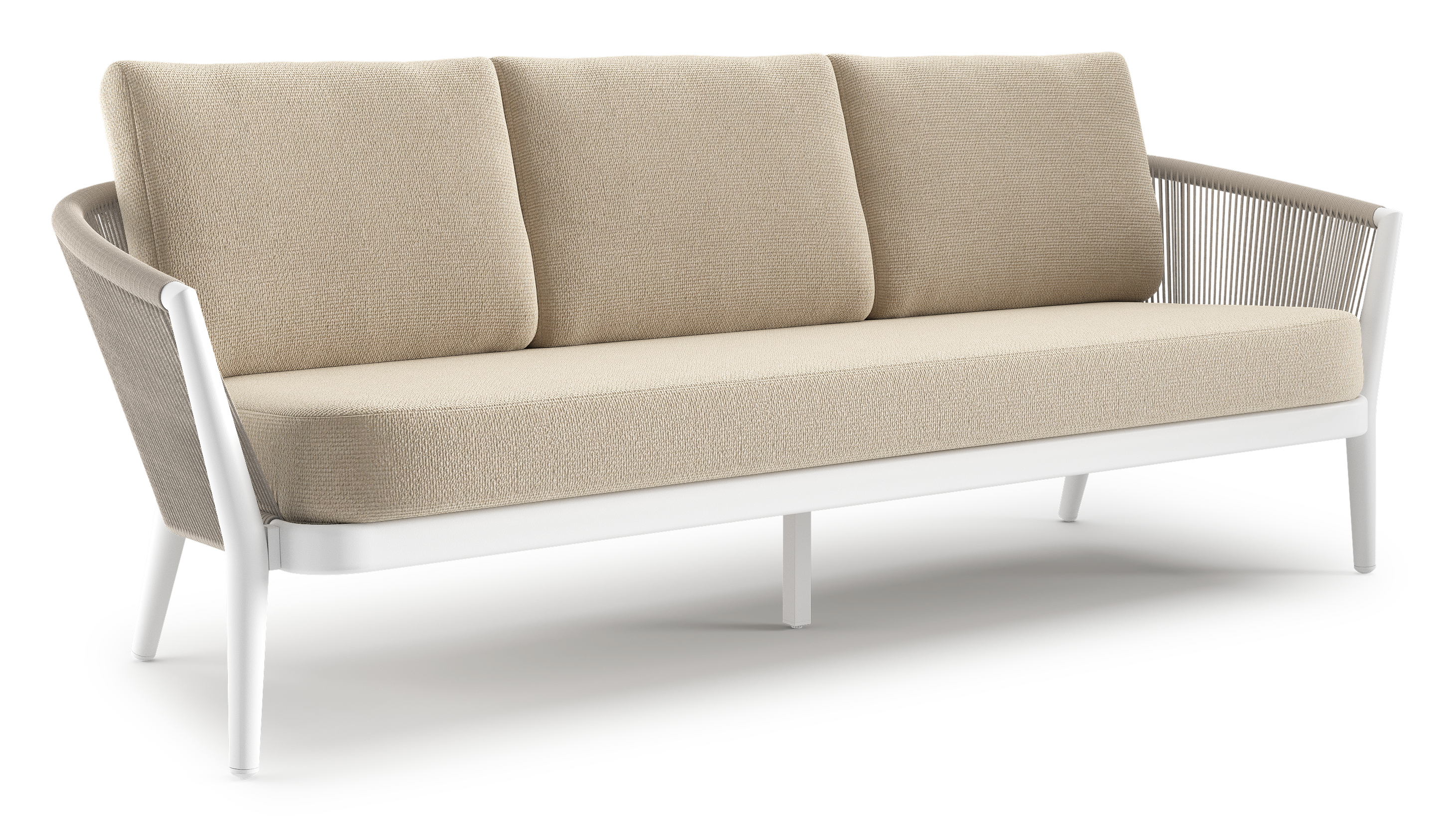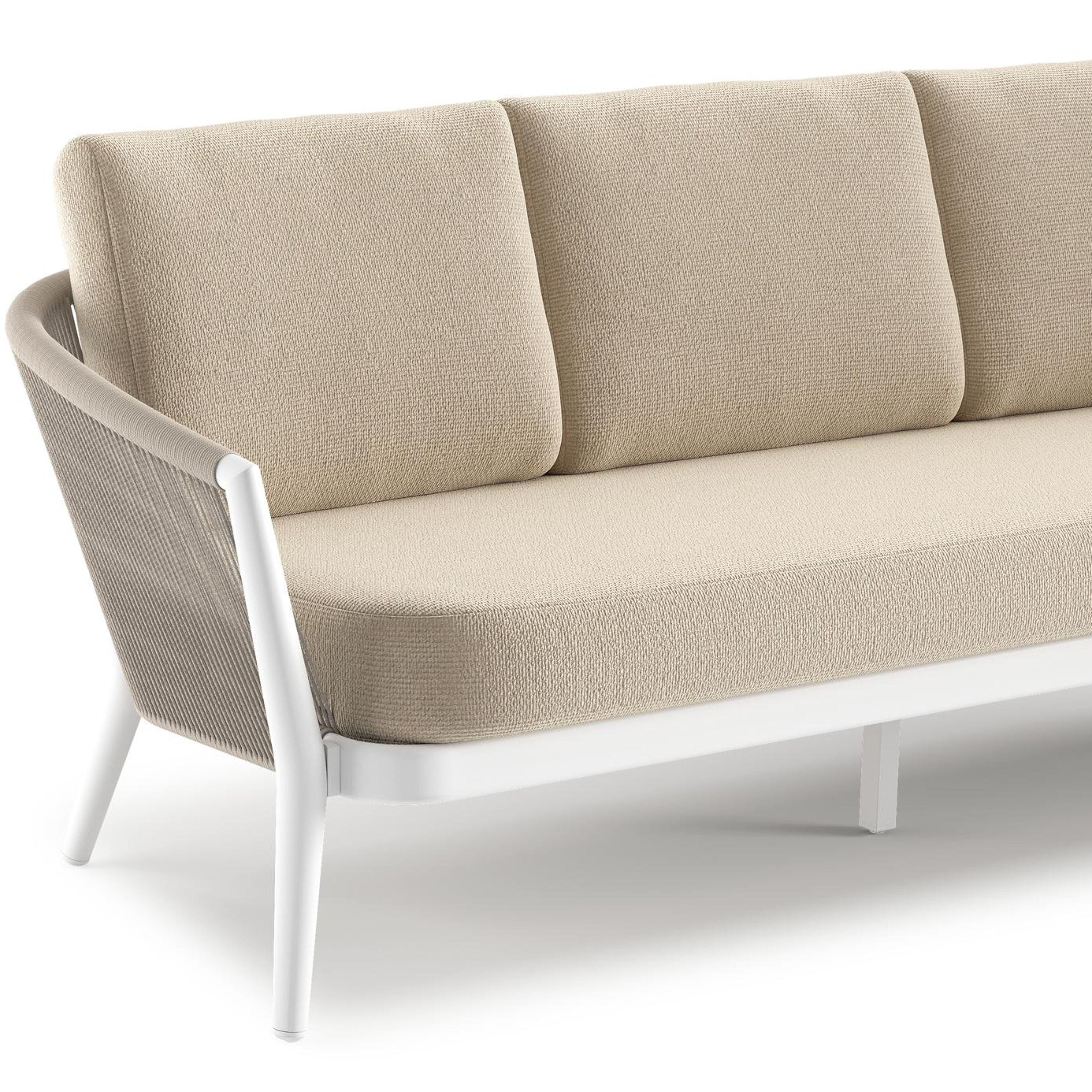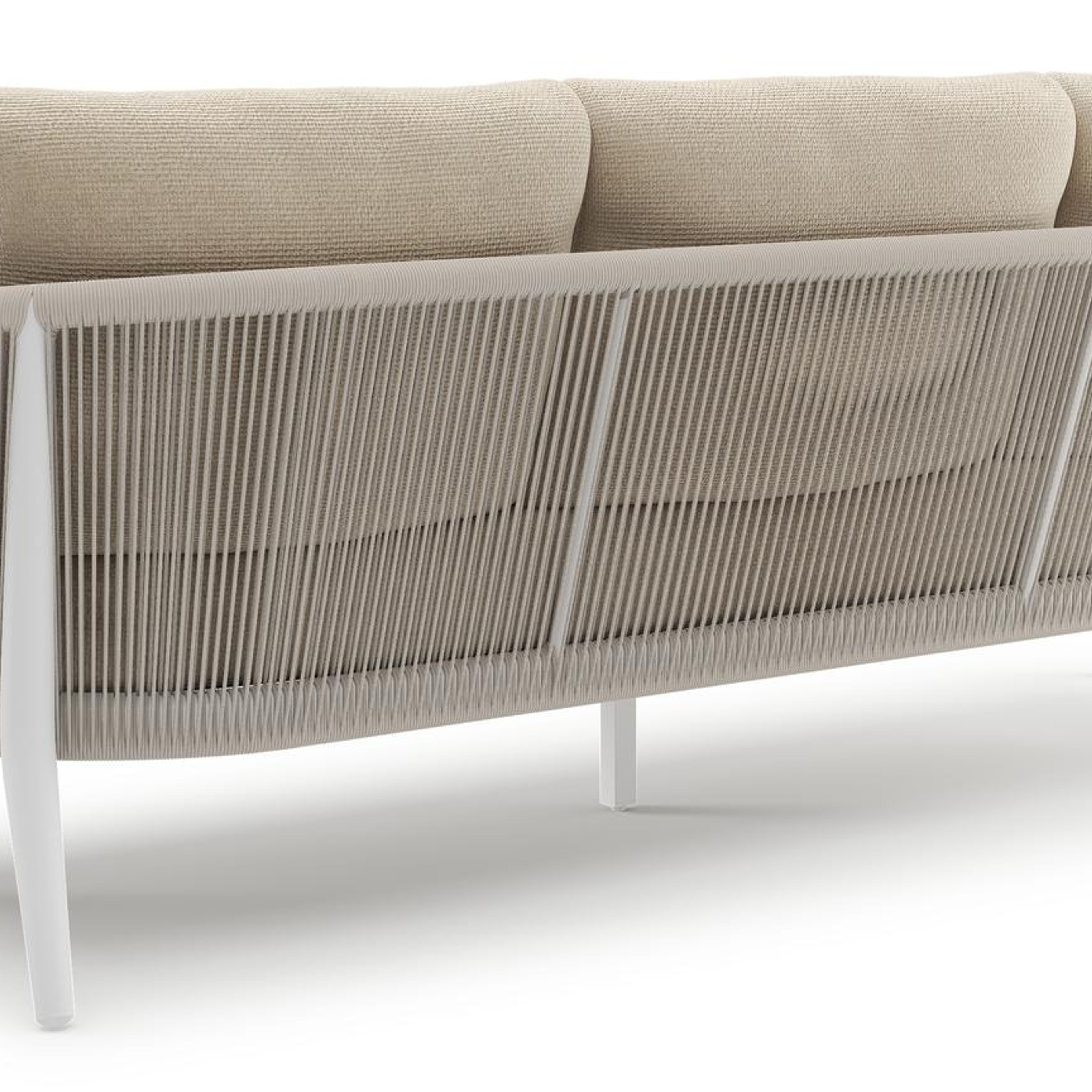 Canapé de jardin Orso en aluminium blanc en corde ronde tissée verticalement beige et coussins en all weather cosytica Althea Chalk | Exterioo mobilier de jardin