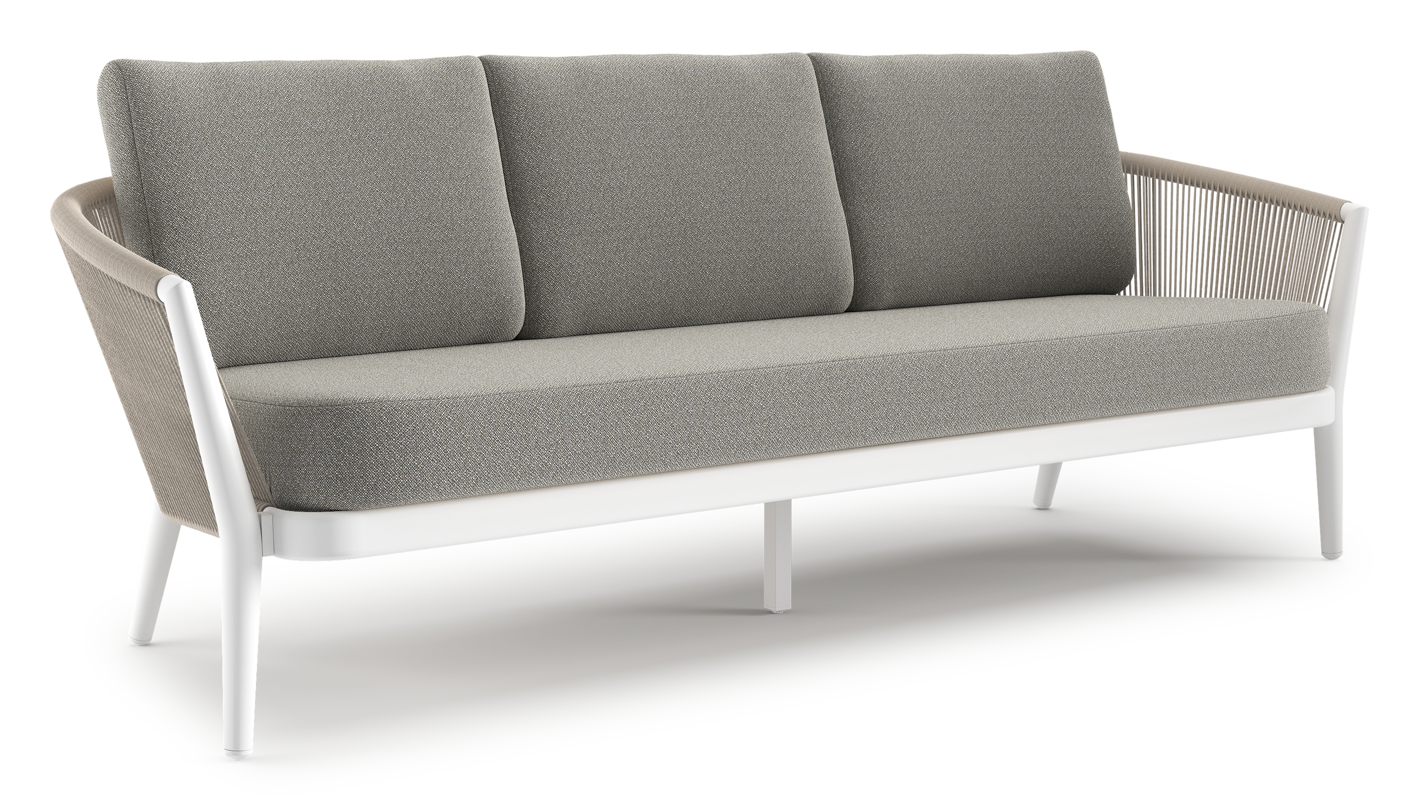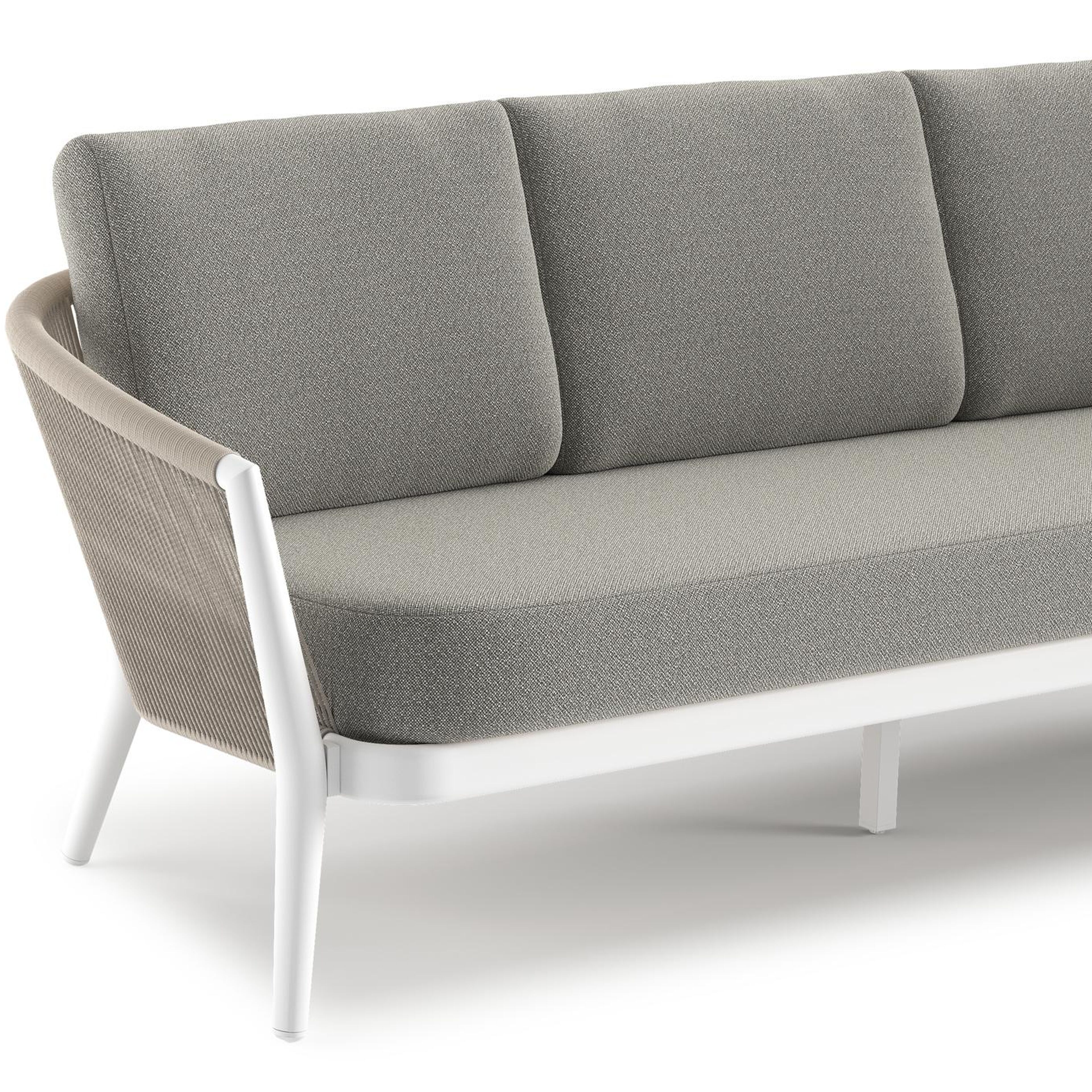 Canapé de jardin Orso en aluminium blanc en corde ronde tissée verticalement beige et coussins en all weather sunbrella® luxe Savane Tunder | Exterioo mobilier de jardin