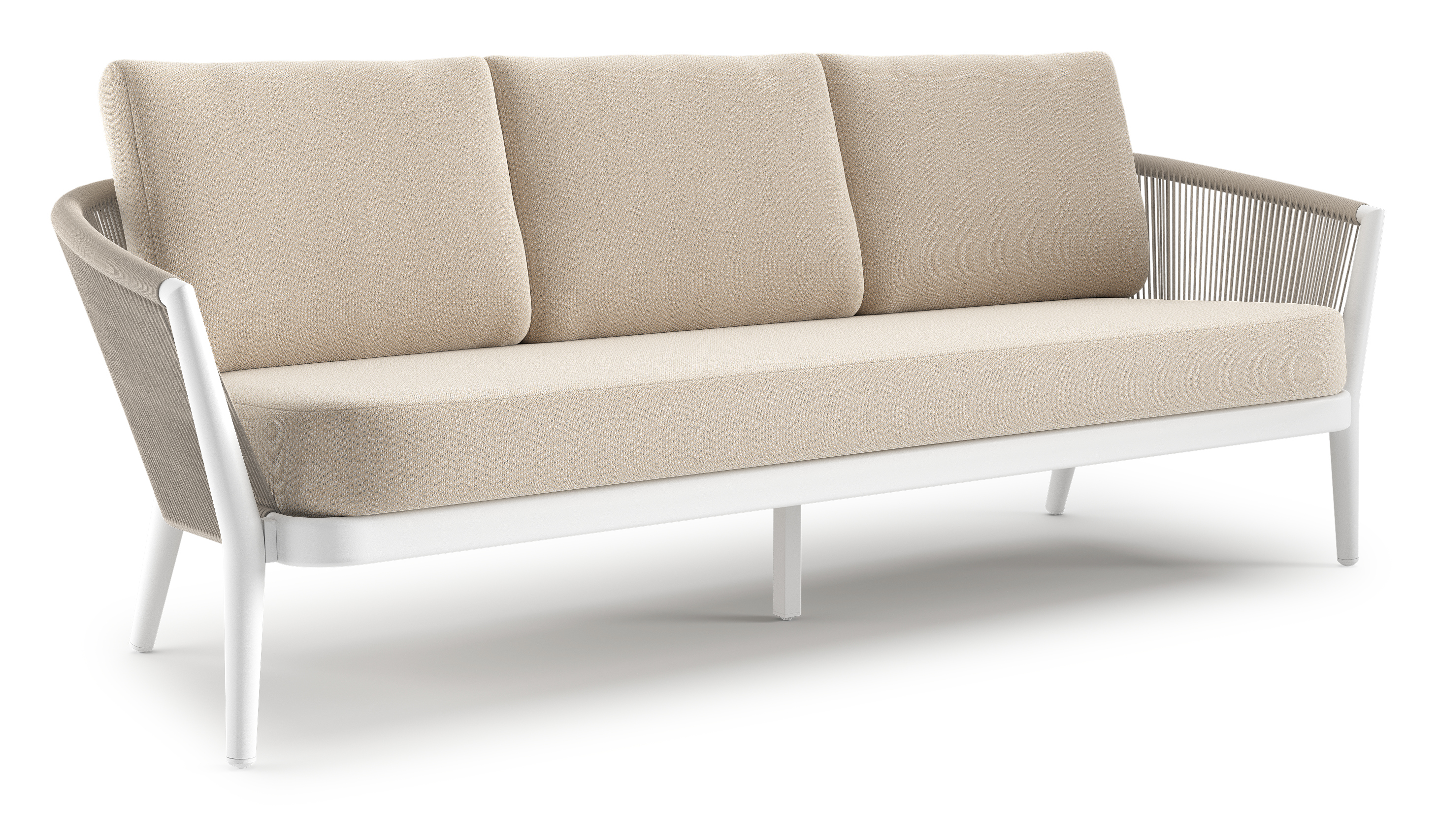 Canapé de jardin Orso en aluminium blanc en corde ronde tissée verticalement beige et coussins en all weather sunbrella® luxe Lopi Sand | Exterioo mobilier de jardin