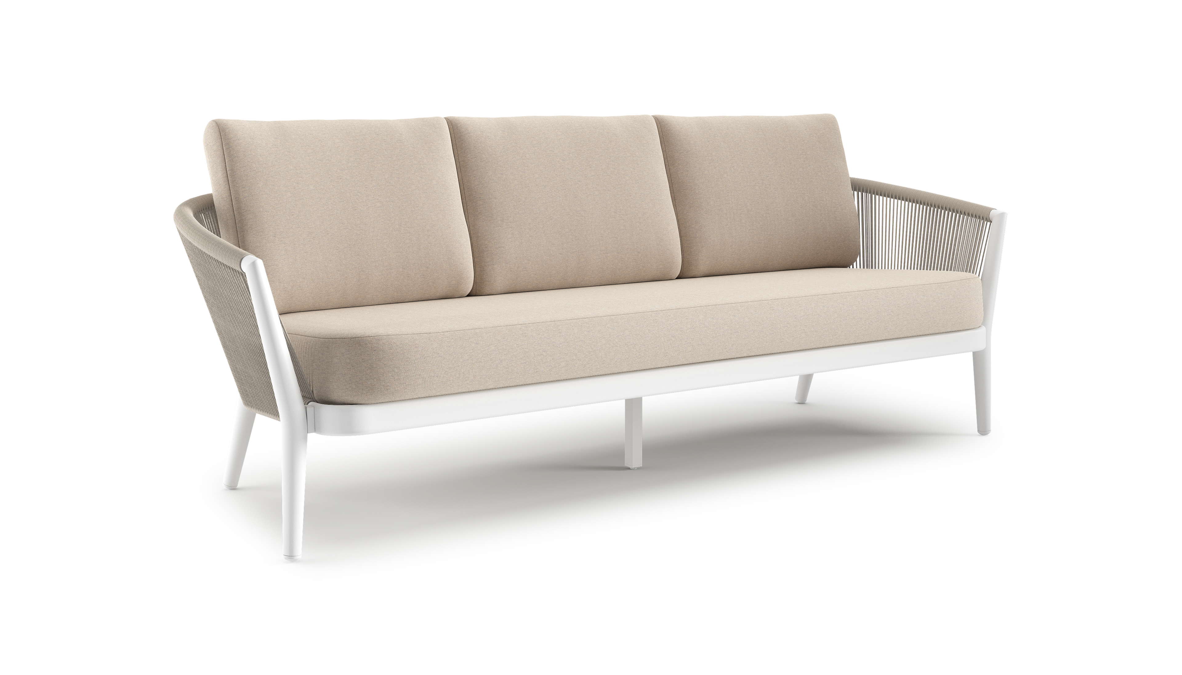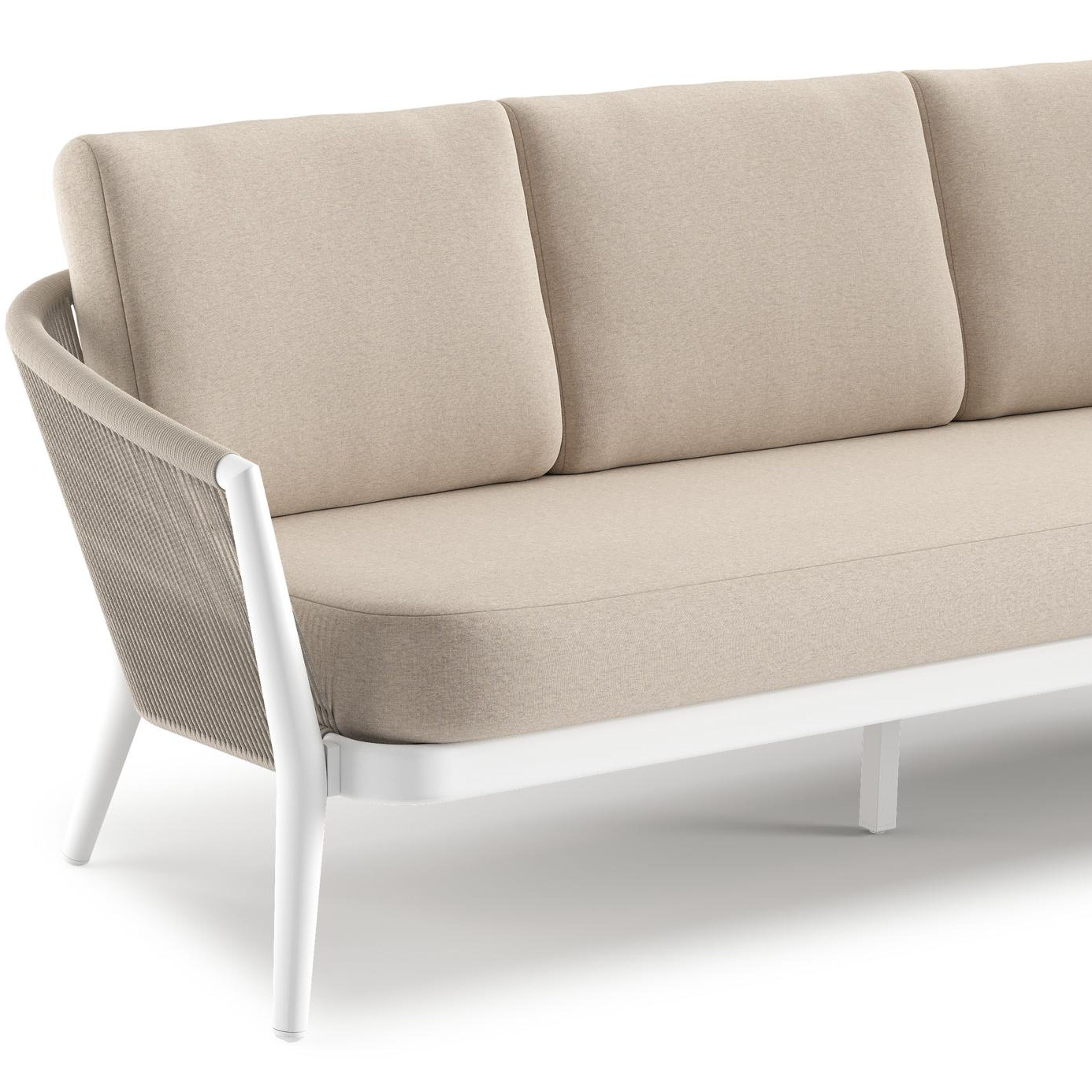 Canapé de jardin Orso en aluminium blanc en corde ronde tissée verticalement beige et coussins en all weather sunbrella® luxe Heritage Ash | Exterioo mobilier de jardin