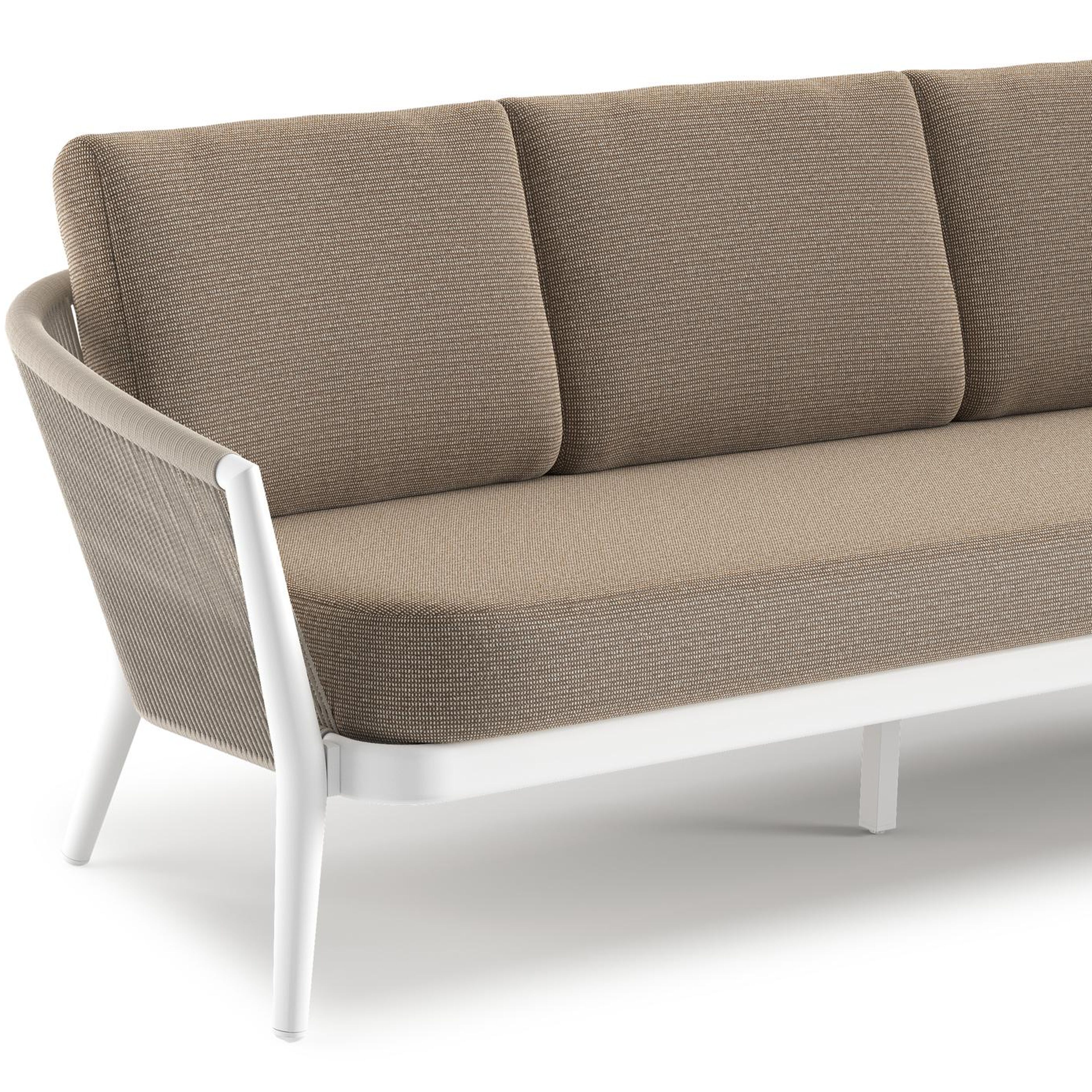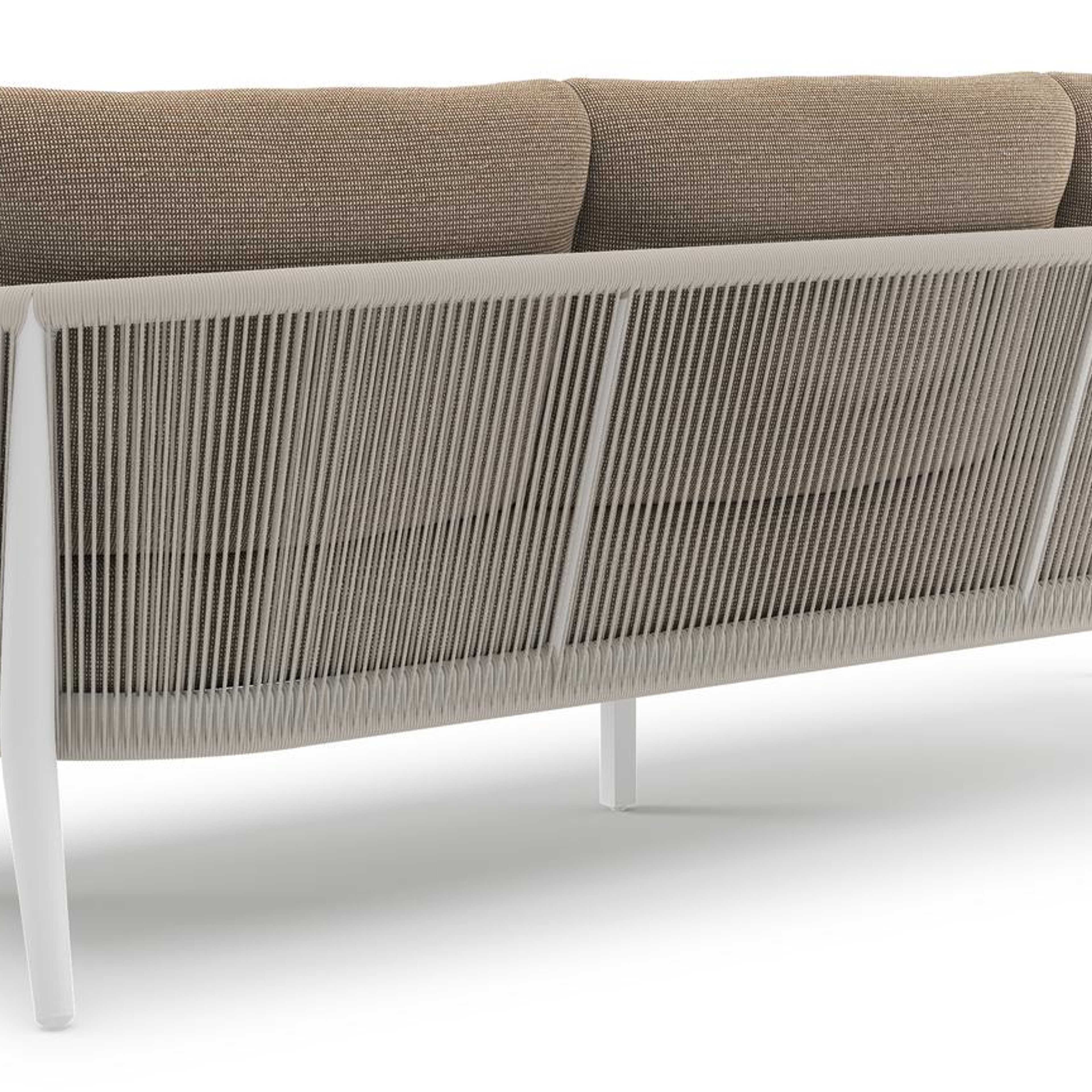 Canapé de jardin Orso en aluminium blanc en corde ronde tissée verticalement beige et coussins en all weather solica Firenze Earth | Exterioo mobilier de jardin